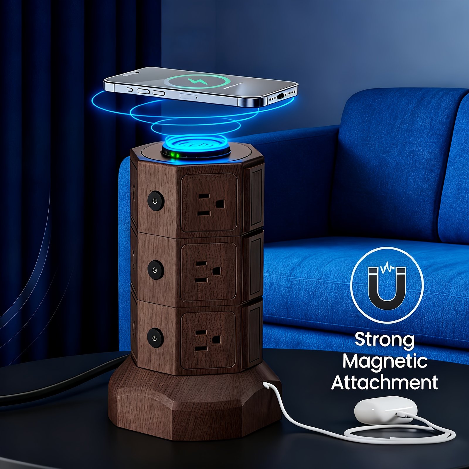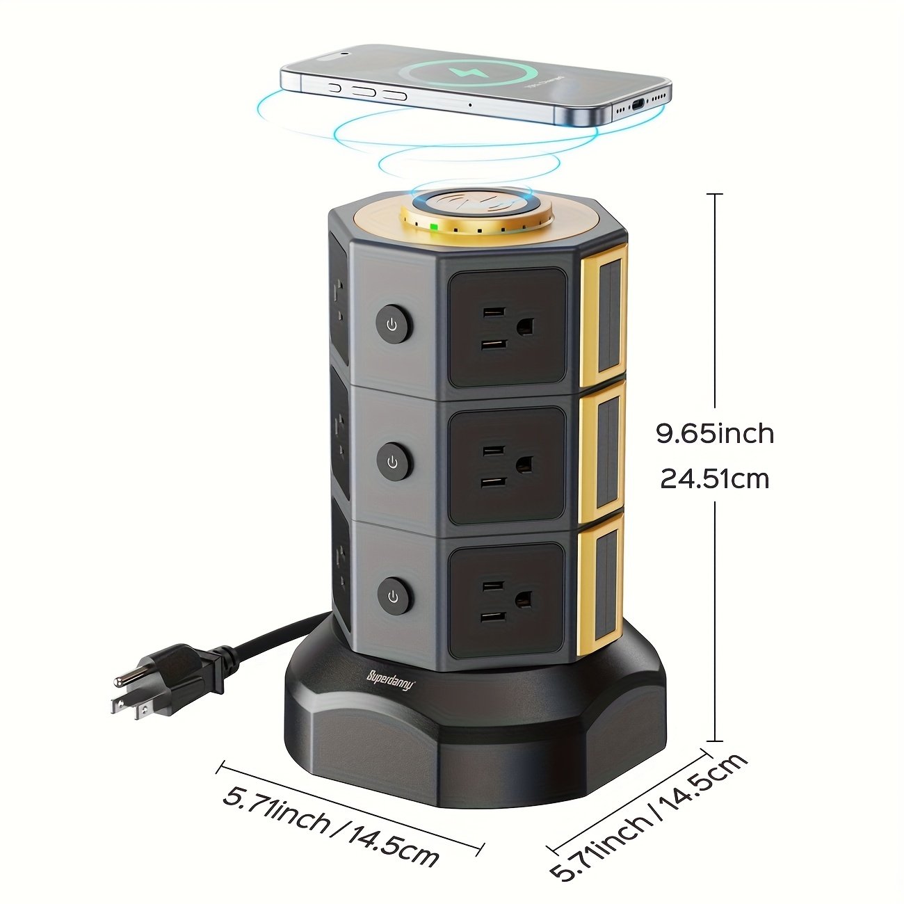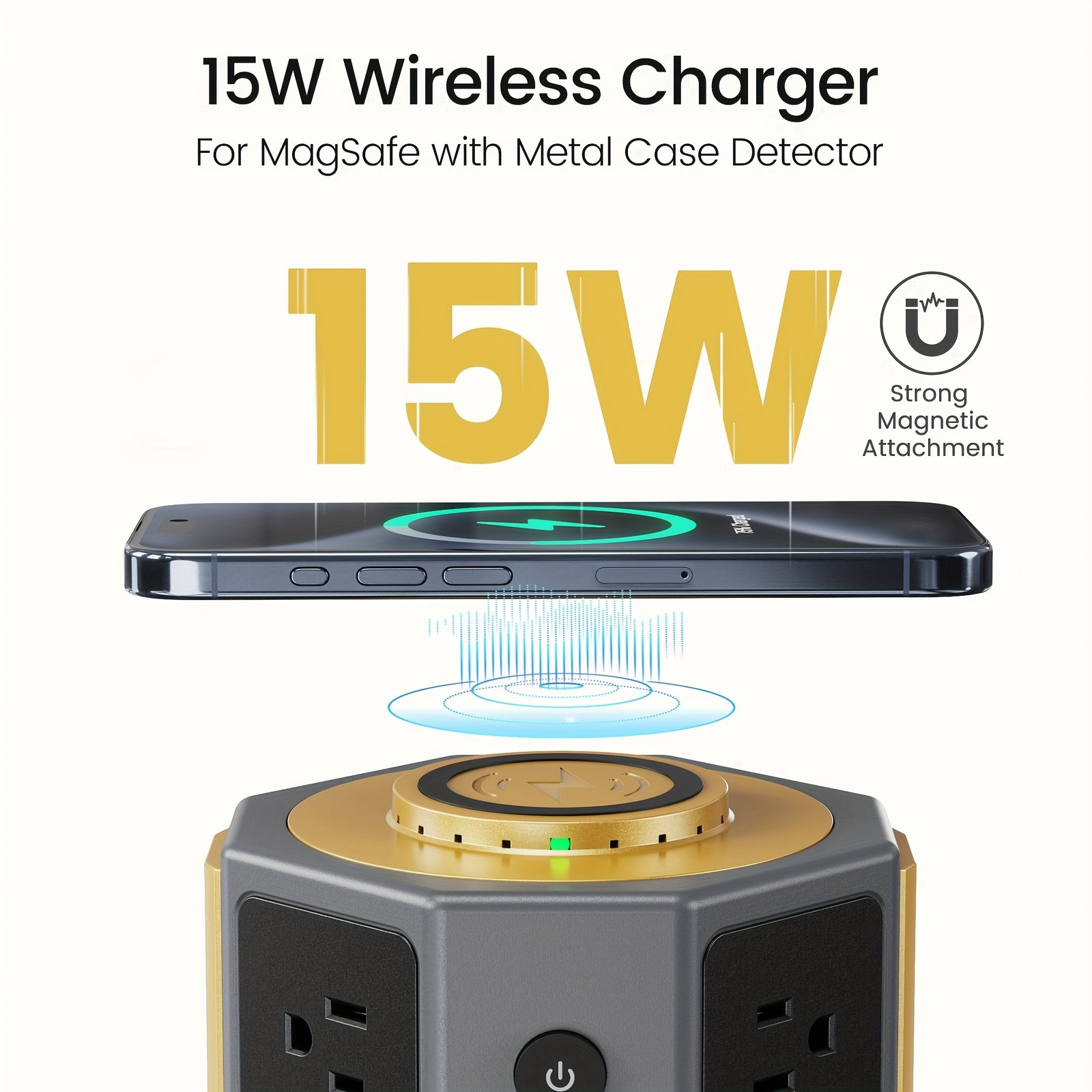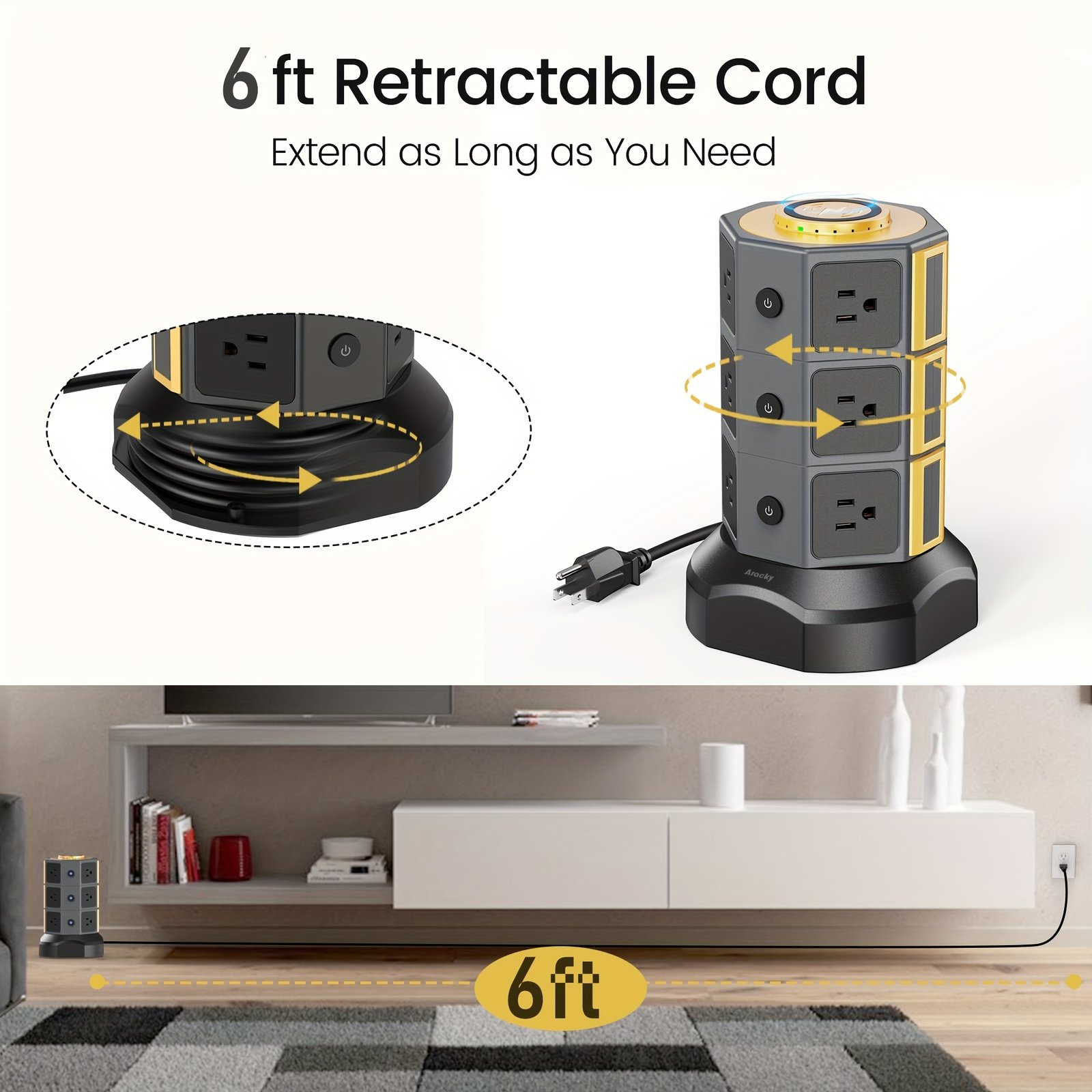 12 AC Outlet Power Strip Tower with 15W Wireless Charging & 6 USB Ports | 3 Ways to Charge | 1050J Surge Protection | 5ft Retractable Cable | for Home Office Dorm | Christmas Gift