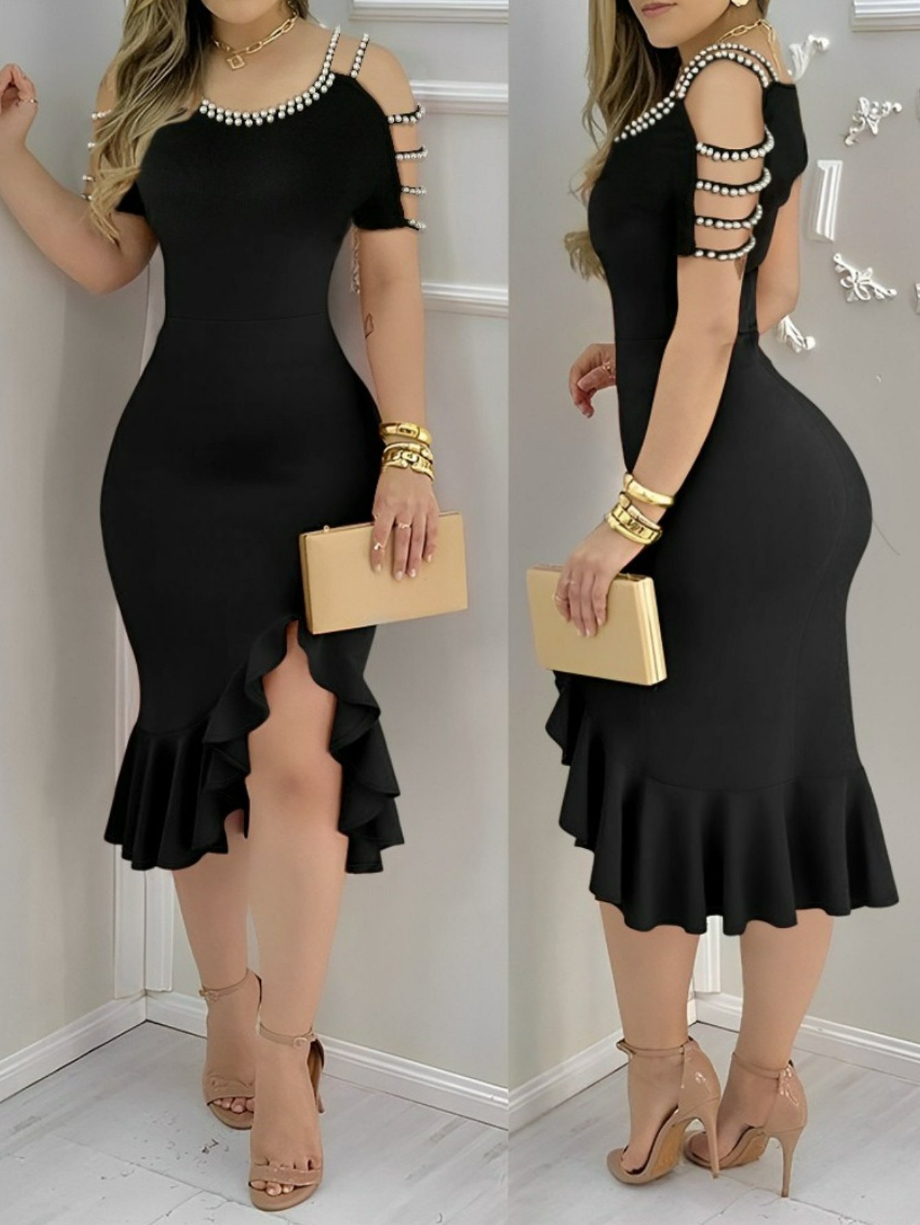 Party Fashion Dresses with Off-Shoulder Ruffles And Evening Slits