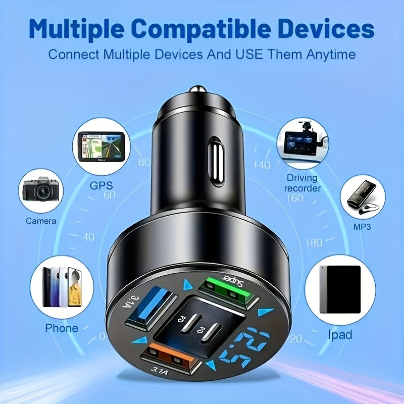 Car Charger with Digital Display | Features 2 PD and 3 USB-C Ports, Quick Charge Adapter for Smartphones and Tablets, Portable In-Car Charger for Drivers and Passengers