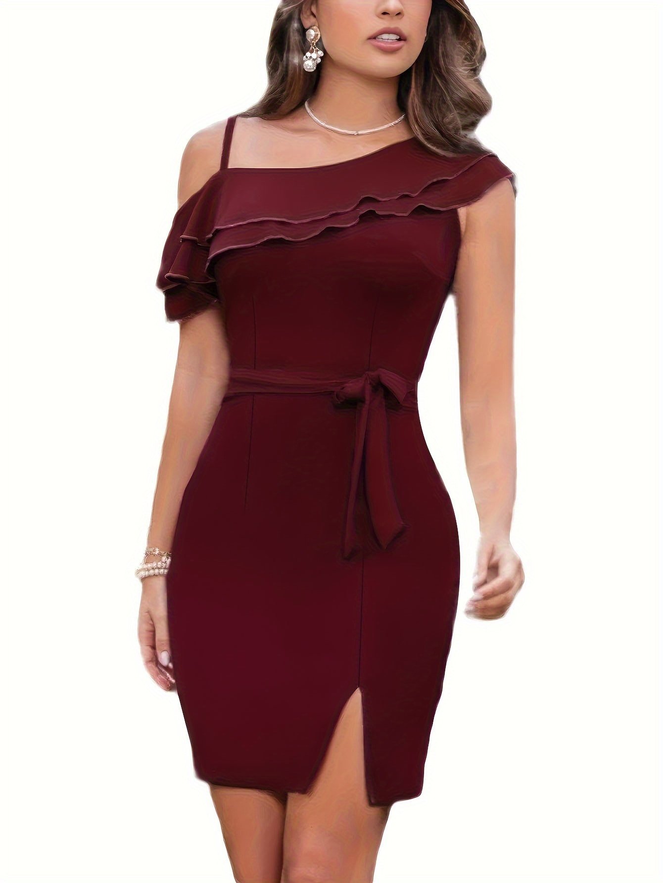 A Burgundy Off-Shoulder Lace-Trimmed Bodycon Dress with a Slit, Nian Nian