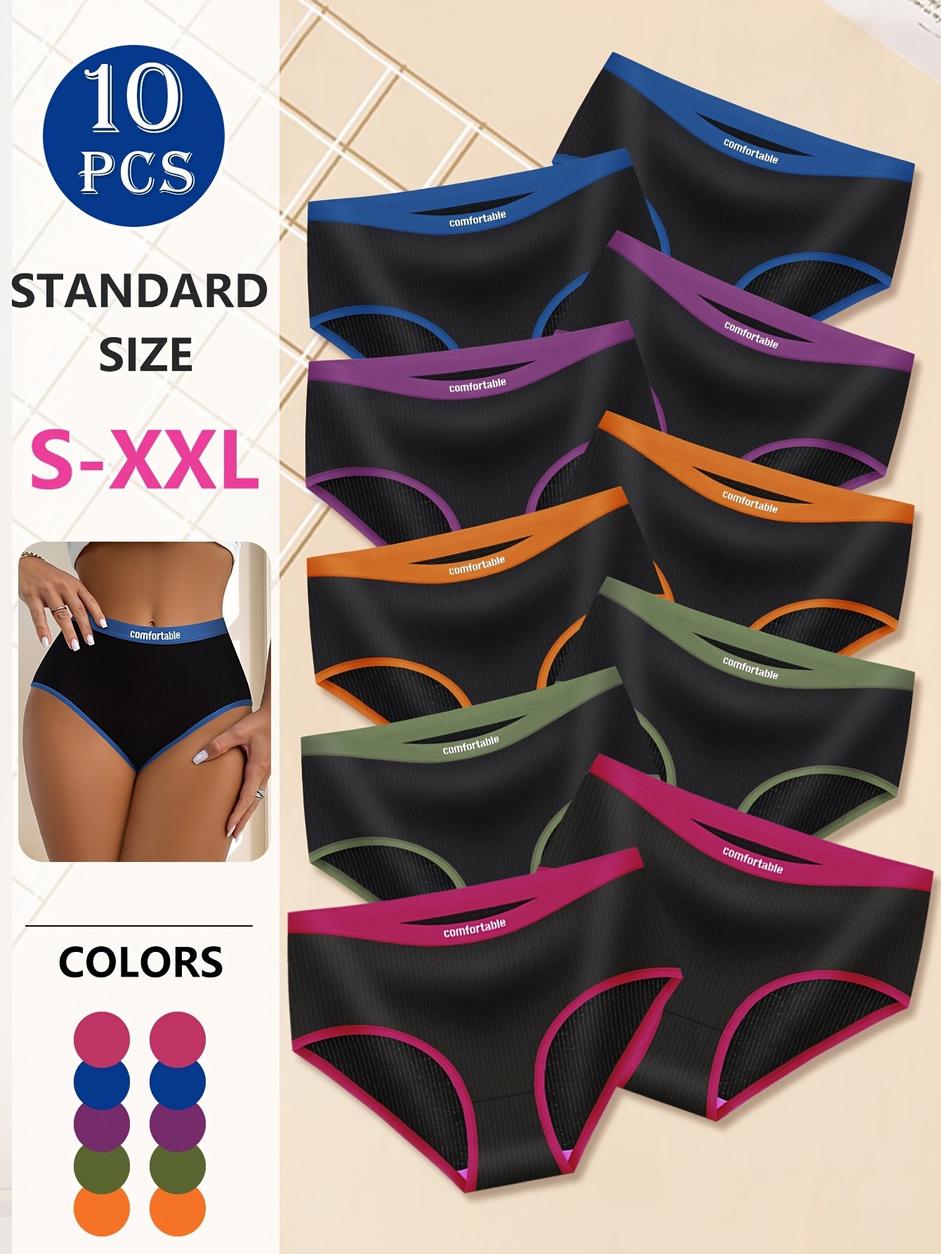 [Comfortable Women’s Panties] 10pcs Comfortable Breathable Women’s Mid-High Waist Panties | Contrast Color Stretch Underwear, Lingerie for Daily Wear