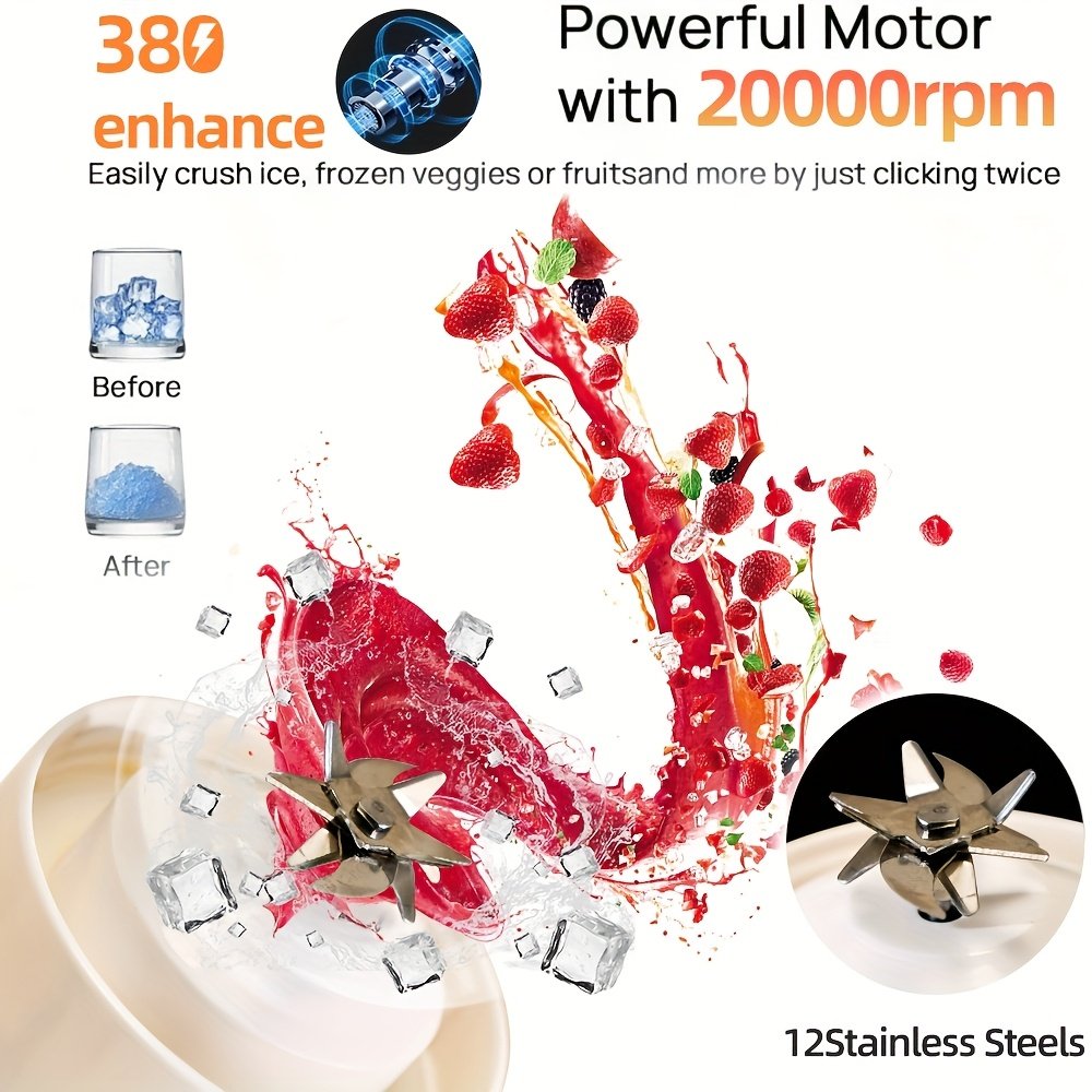 Compact Blender Designed for Shakes And Smoothies, Featuring a USB C Rechargeable Juicer Cup Equipped with 12 Stainless Steel Blades, a Powerful 20000Rpm Motor, a 1500Mah Battery, Easy Cleaning, And Ideal for Personal Use While Traveling, at Home