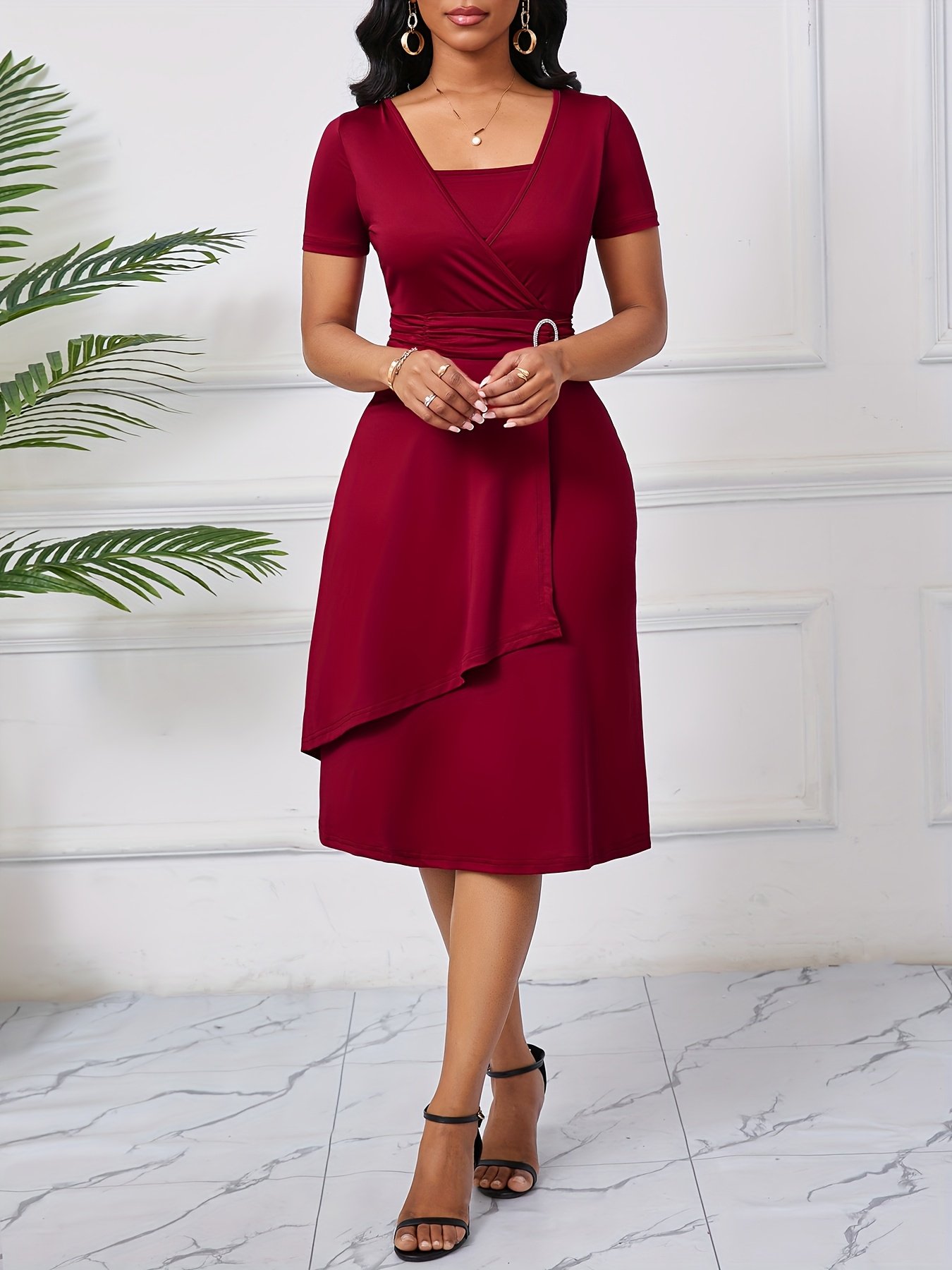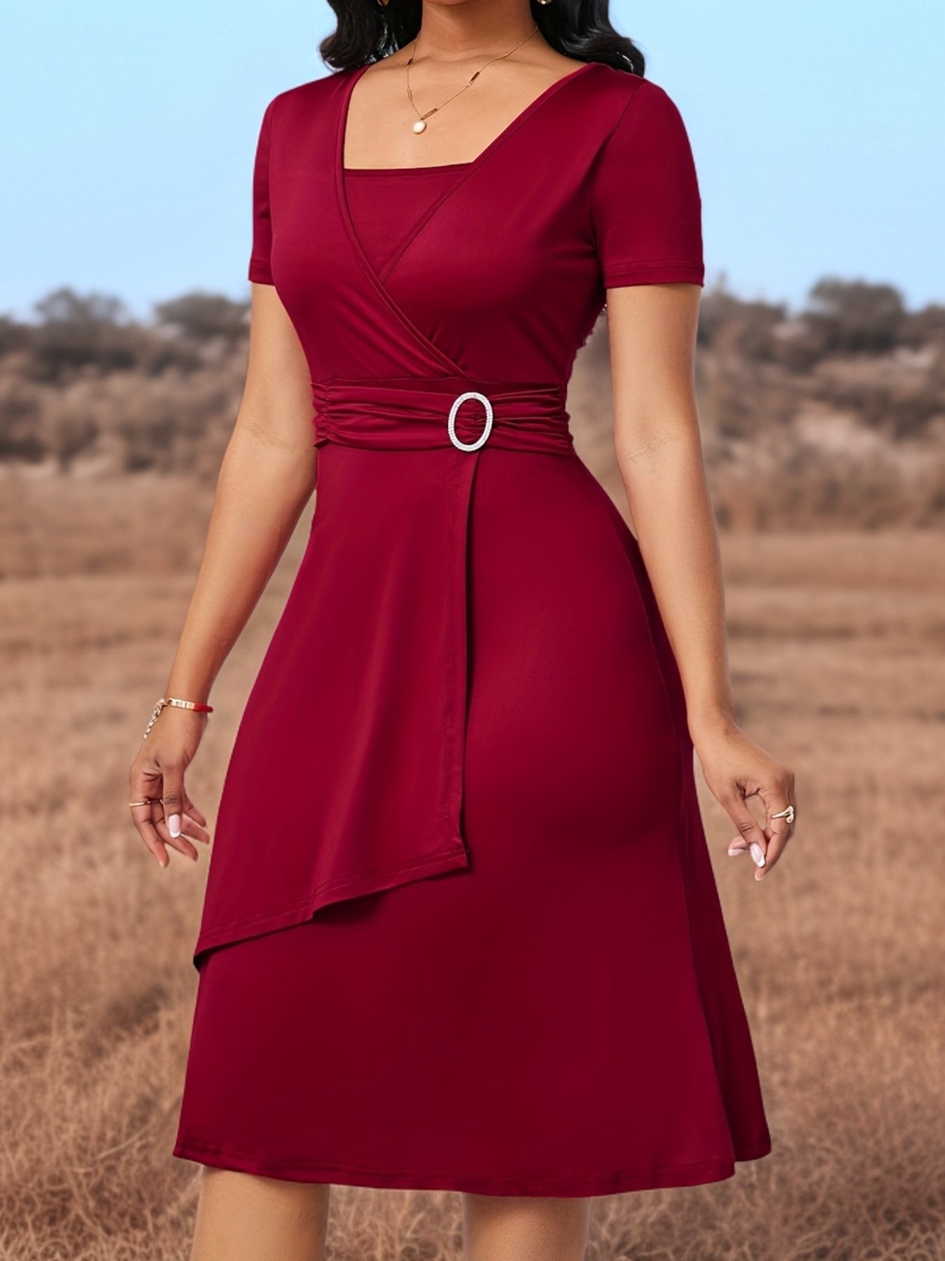 Elegant Square Neck A-Line Dress for Women, Spring/Summer Knit Polyester with Metallic Accents, Pleated Waist and Asymmetrical Hem, Perfect for Parties and Holidays
