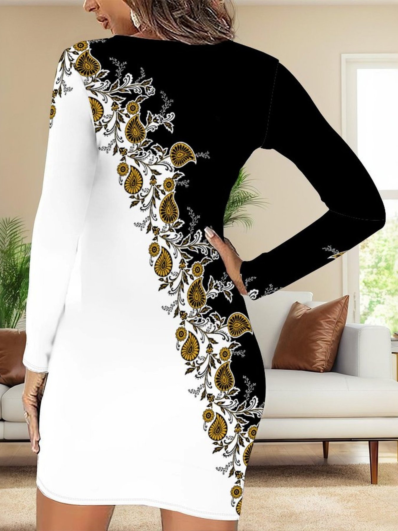Fashionable Casual Sporty Women’S Body-hugging Dress | 3D Full-body Tie-dyed Patterns, Geometric Patterns, Flower Patterns, Printed Patterns, Long-sleeved Crew Neck, Slim Fit, Straight Hem, Suitable for Evening Dates