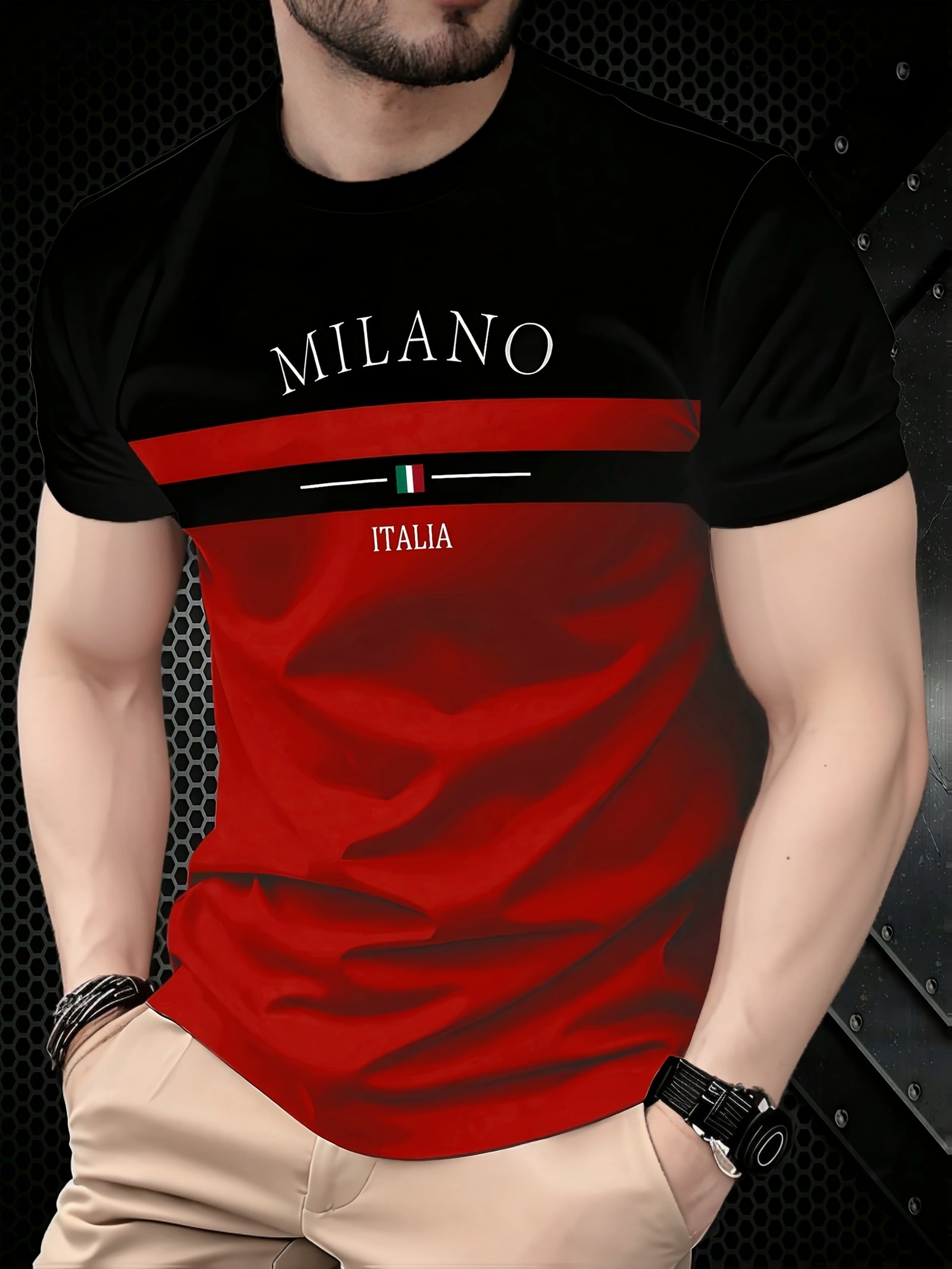 Fashionable Milan-Style Patchwork Short-Sleeve T-Shirt – Classic Black And Red Design, Featuring a Round Neck And a Print of The Word ‘MILANO’, Showcasing a Stylish Look, Perfect for Summer Men’S Wear
