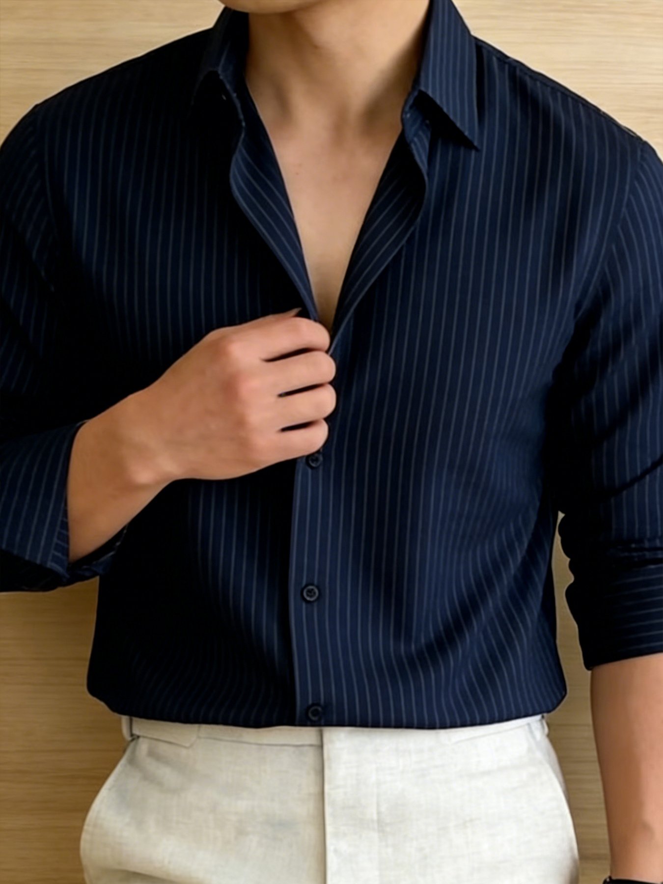 Men’s Business and Leisure Vertical Striped Long Sleeved Shirt, Simple and Slim Fit Single Breasted Lapel Top, Comfortable and Breathable Fabric, Suitable for Spring and Summer Vacations, Daily Outings, Business Commuting, and Leisure Social Occasion