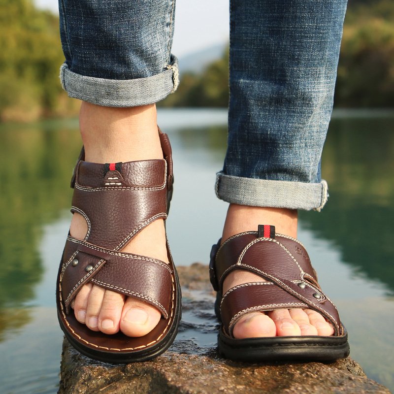 Men’S Casual Sandals | Genuine Leather, Rubber Sole, Comfortable Sole, Lightweight, Easy Wear, Slip On Closure, Vintage Style, Perfect for Daily & Casual Wear, Suitable for Spring/Summer