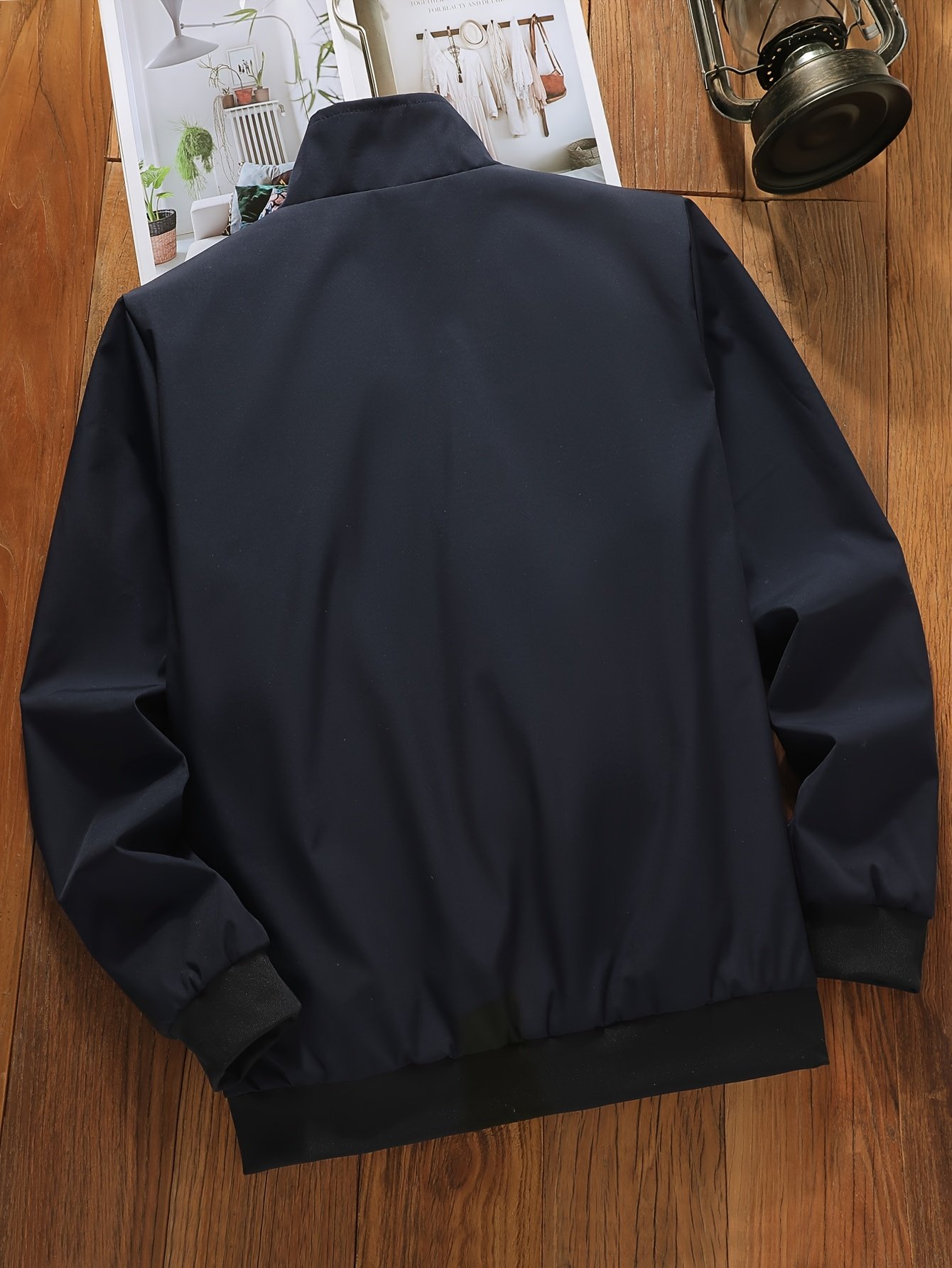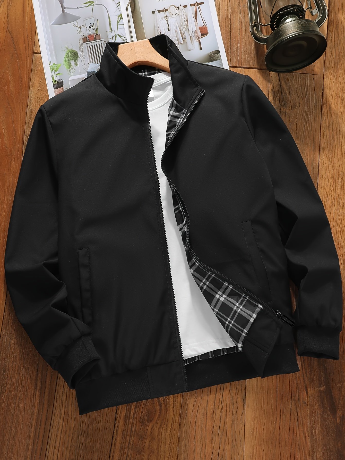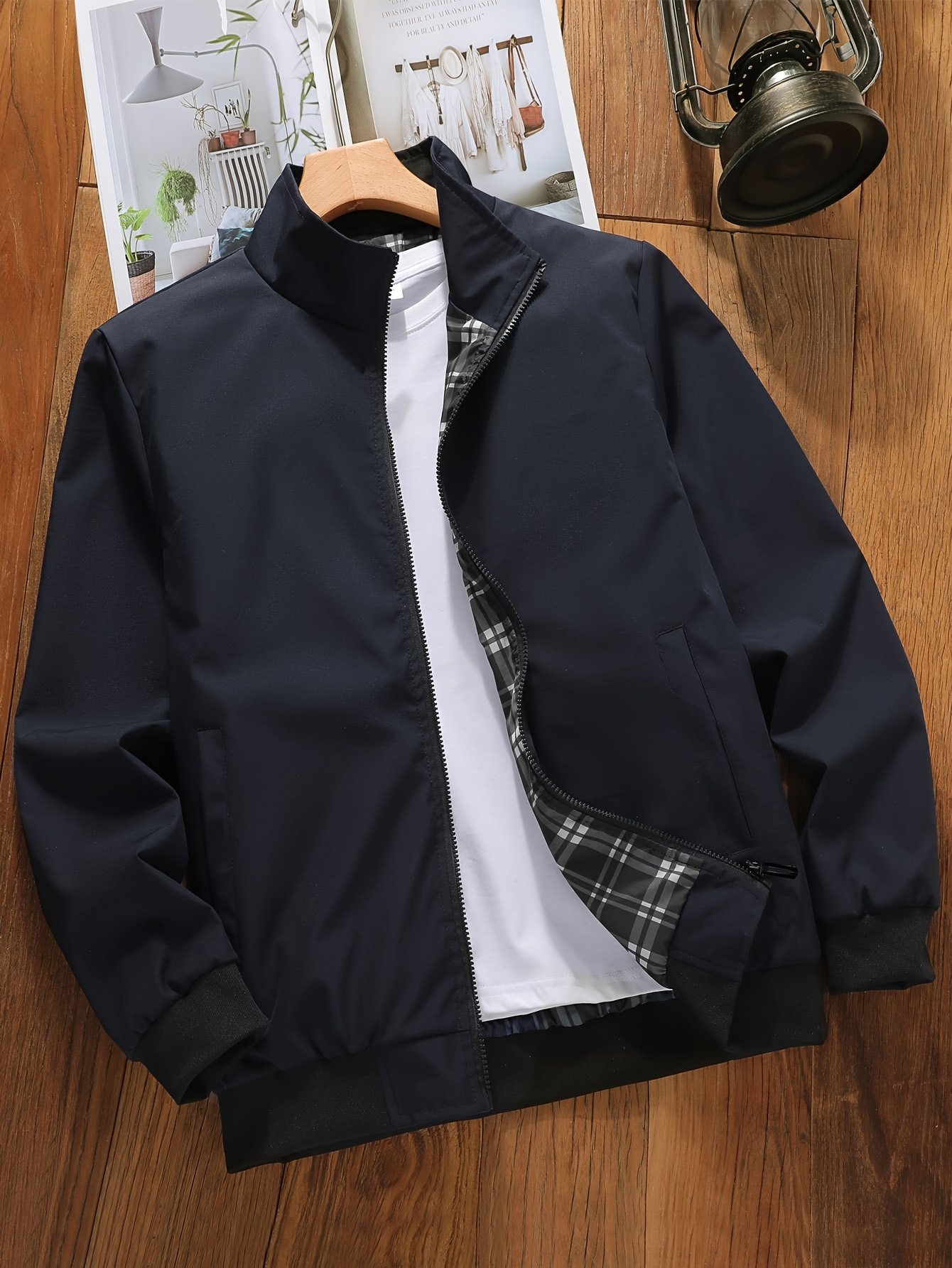 Men’s Casual Solid Color Collar Jacket, Plaid Lining, Stand-up Collar, Front Zipper, Side Pockets, All-season Versatile Polyester Jacket, Suitable for Casual Wear