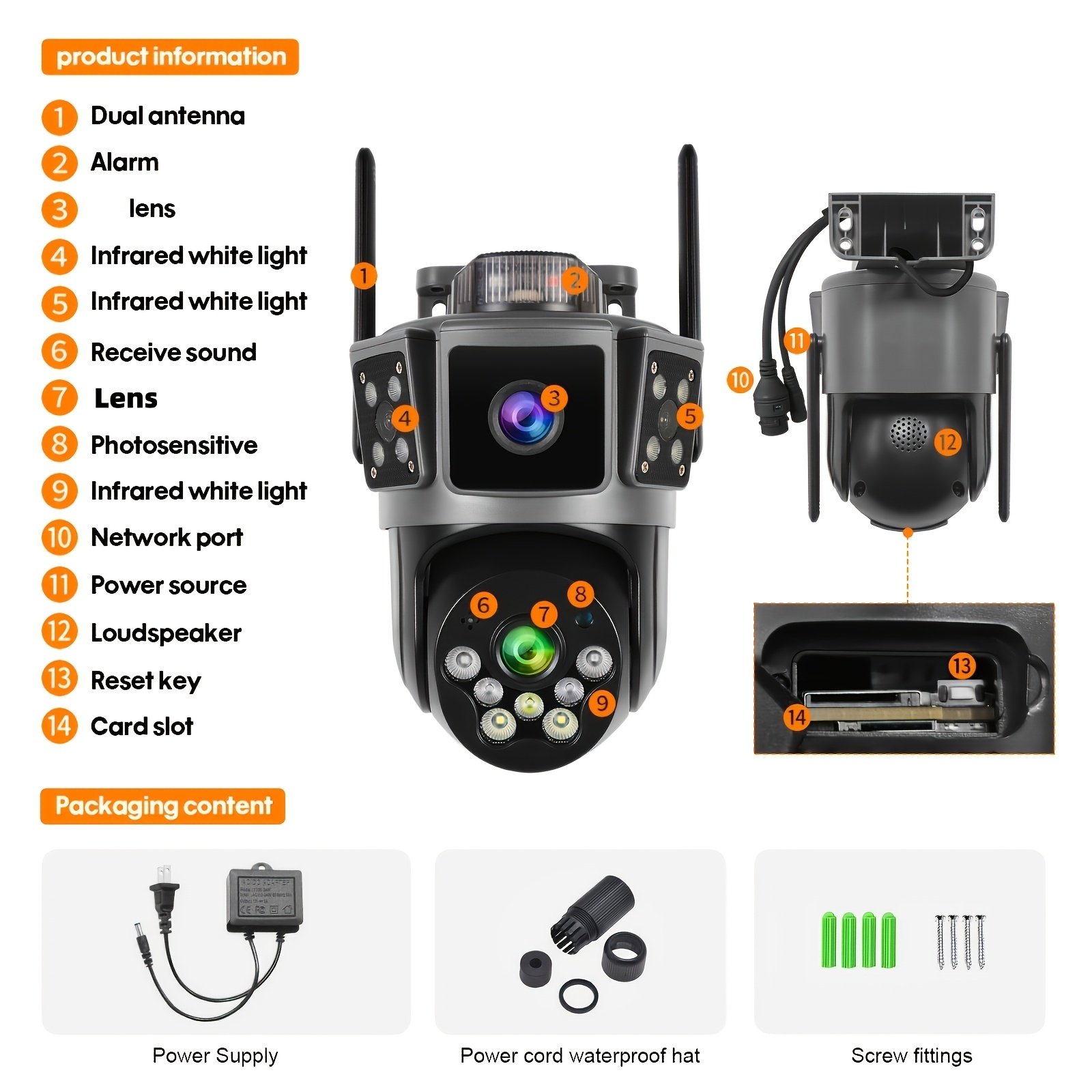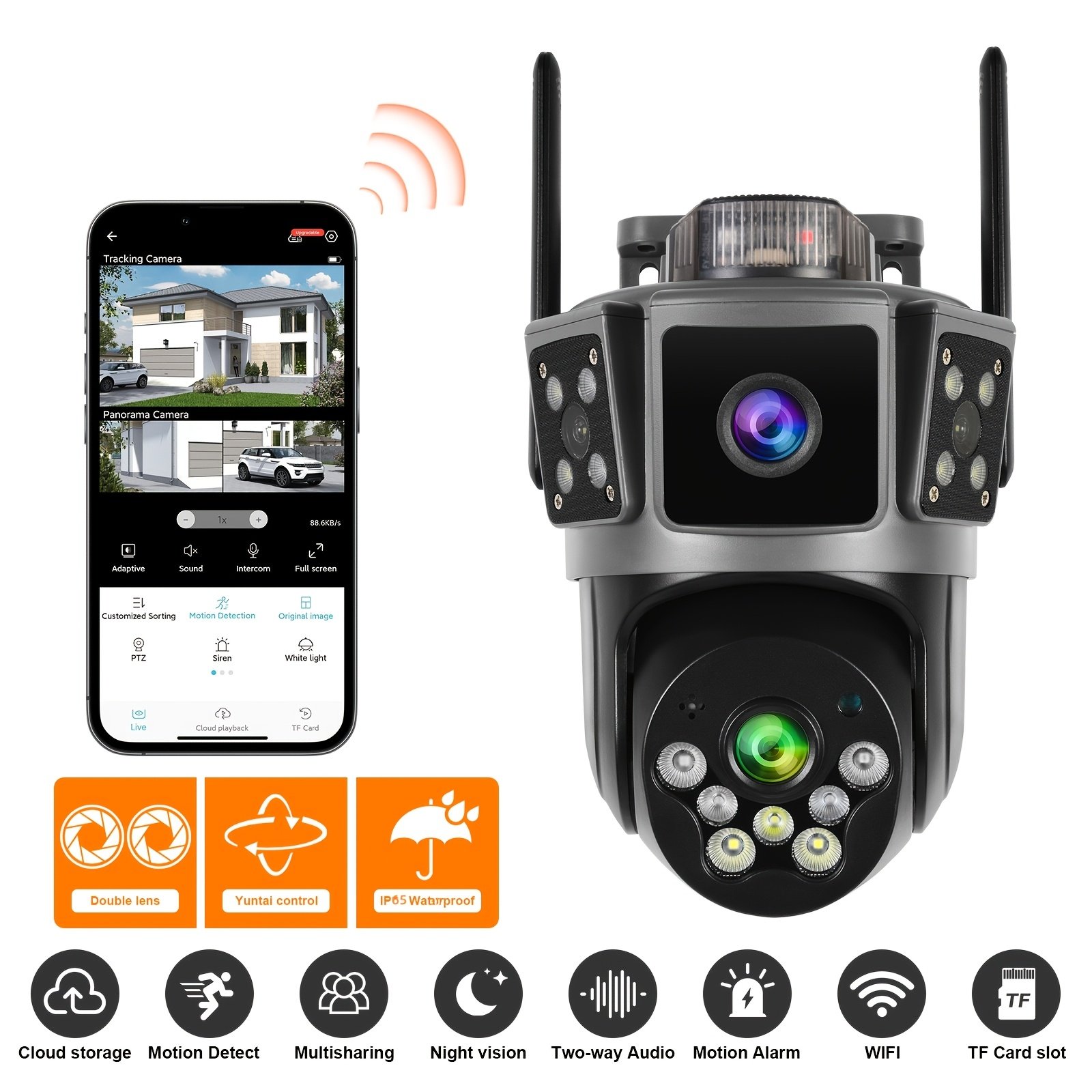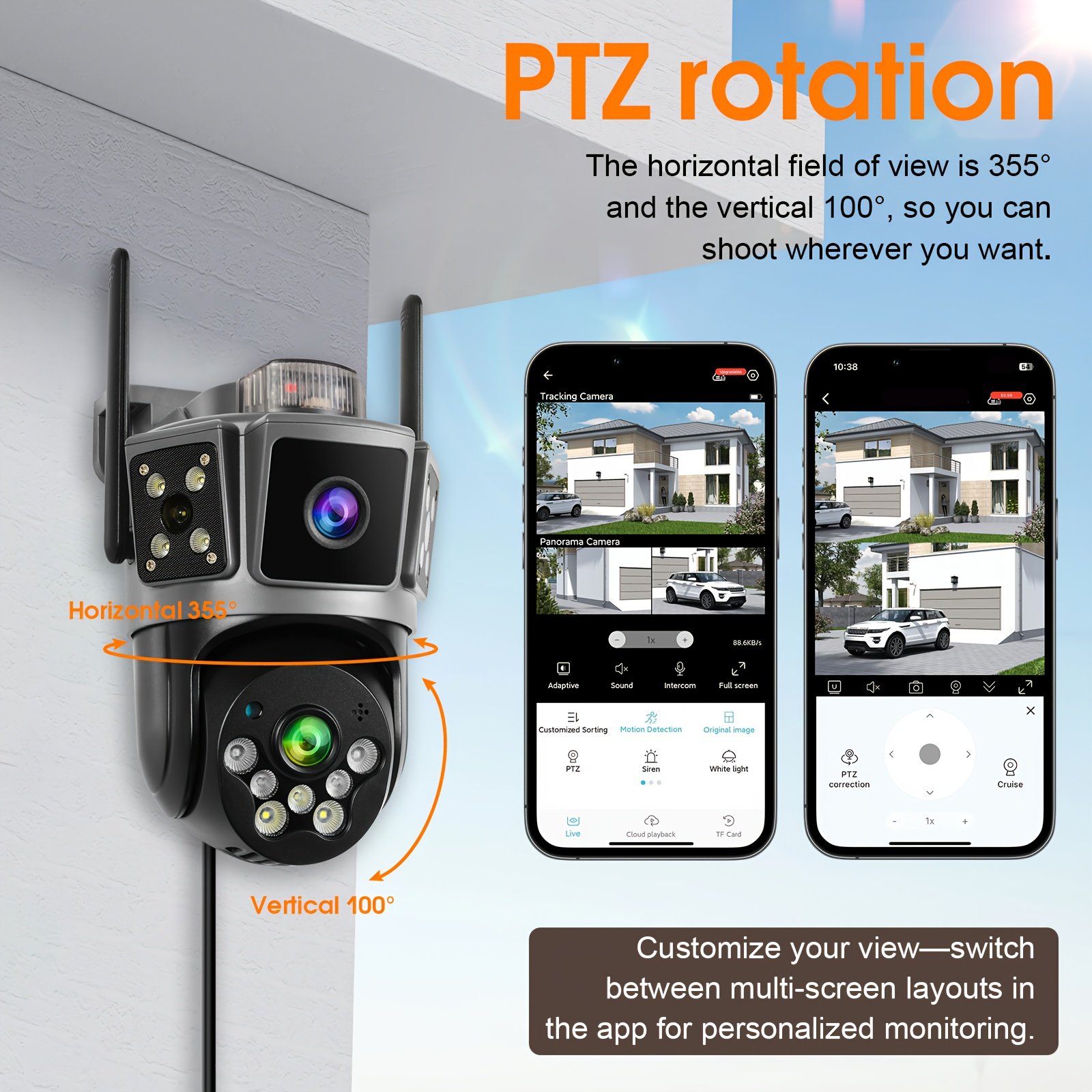 Outdoor Dual Lens Safety Camera With 355 ° Pan Tilt Rotation And No Blind Spots For Monitoring. Supports WIFI Connection And Adapts To Smart Home Scenarios. The Color Night Vision Function Ensures Clear Imaging At Night, And The AI Human Motion Sens