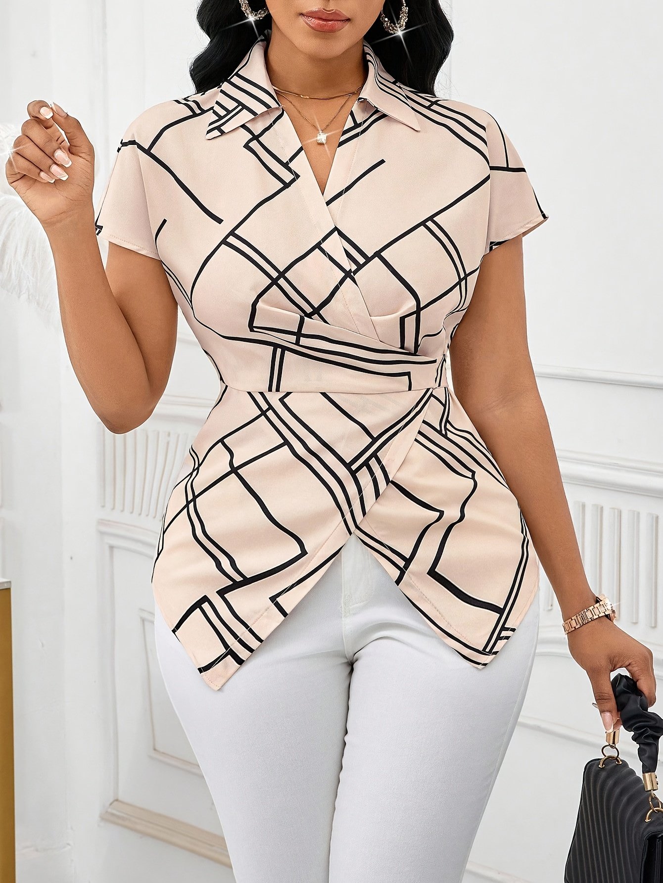 Plus Size – Women’S Geometric Print Button- Asymmetric Hem Short Sleeve Casual Shirt | Elegant V-neck,
