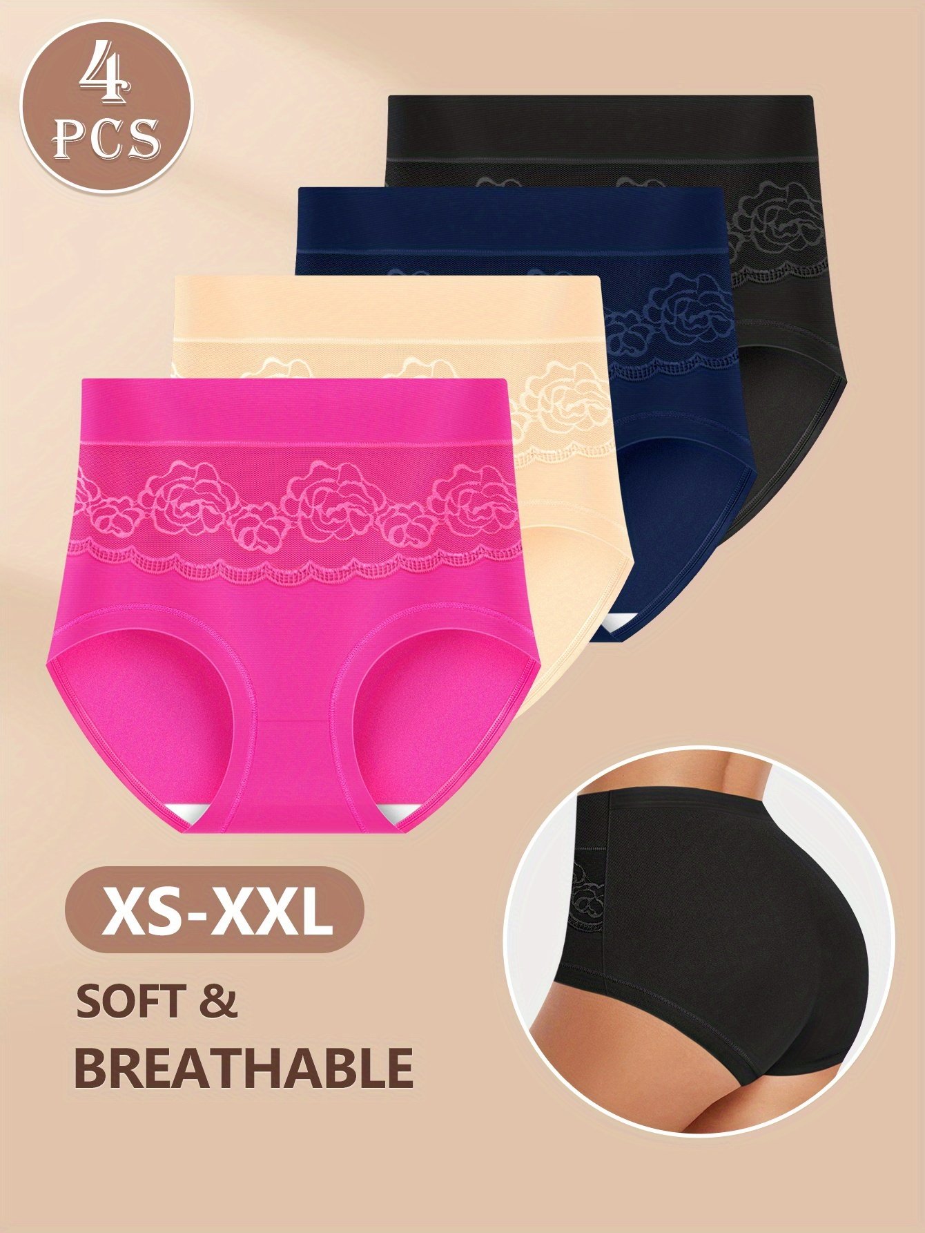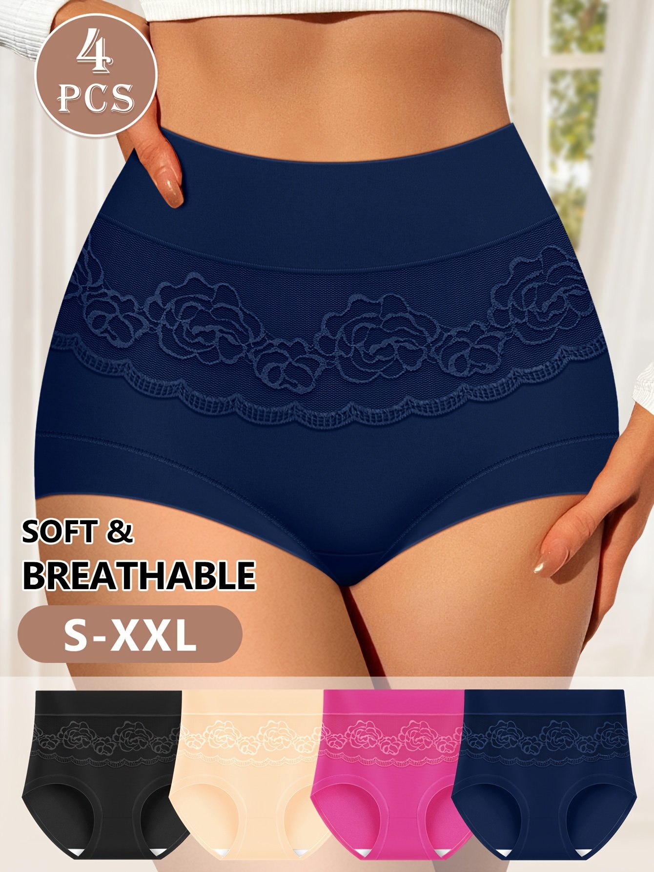 Set of 4 Rose-Patterned High-Waisted Seamless Shaping Panties with a Lace Design That Doesn’T Roll. One Size Fits XS-XXL, Featuring Breathable Mesh Fabric. Comfortable And Soft Texture Available in Multiple Colors Including Fuchsia, Black, Beige