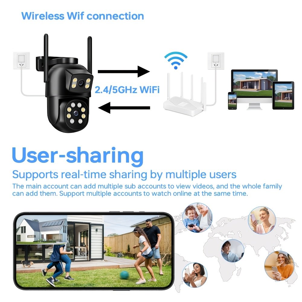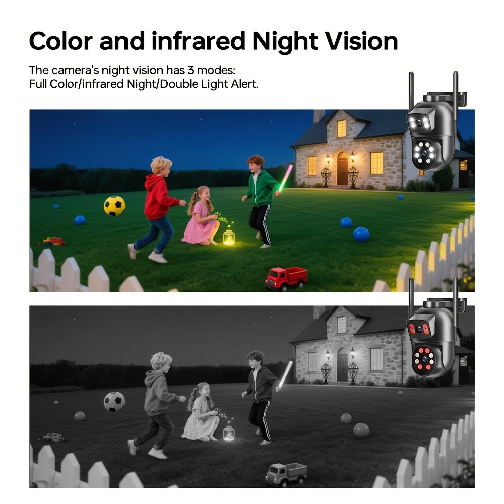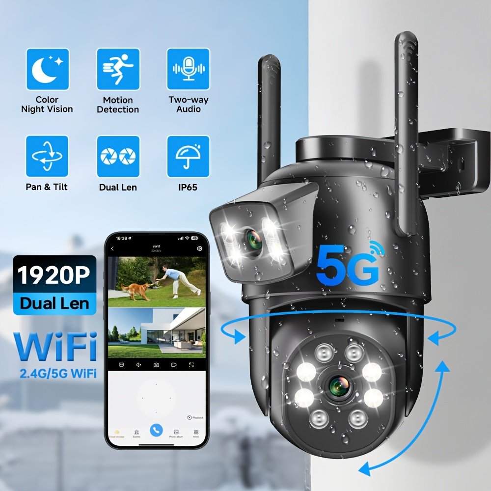 Smart Outdoor Security Camera Dual Lens, Wireless 2.4/5GHz WiFi Surveillance Camera, Pan Tilt, PIR Motion Detection, Color Night Vision Spotlight, IP65, USB Powered