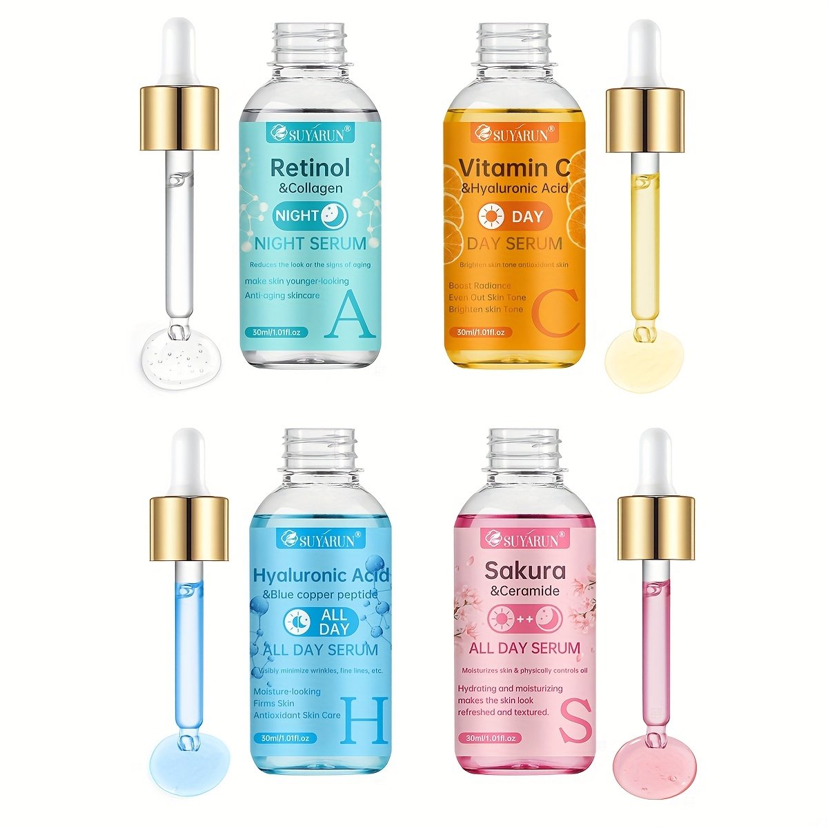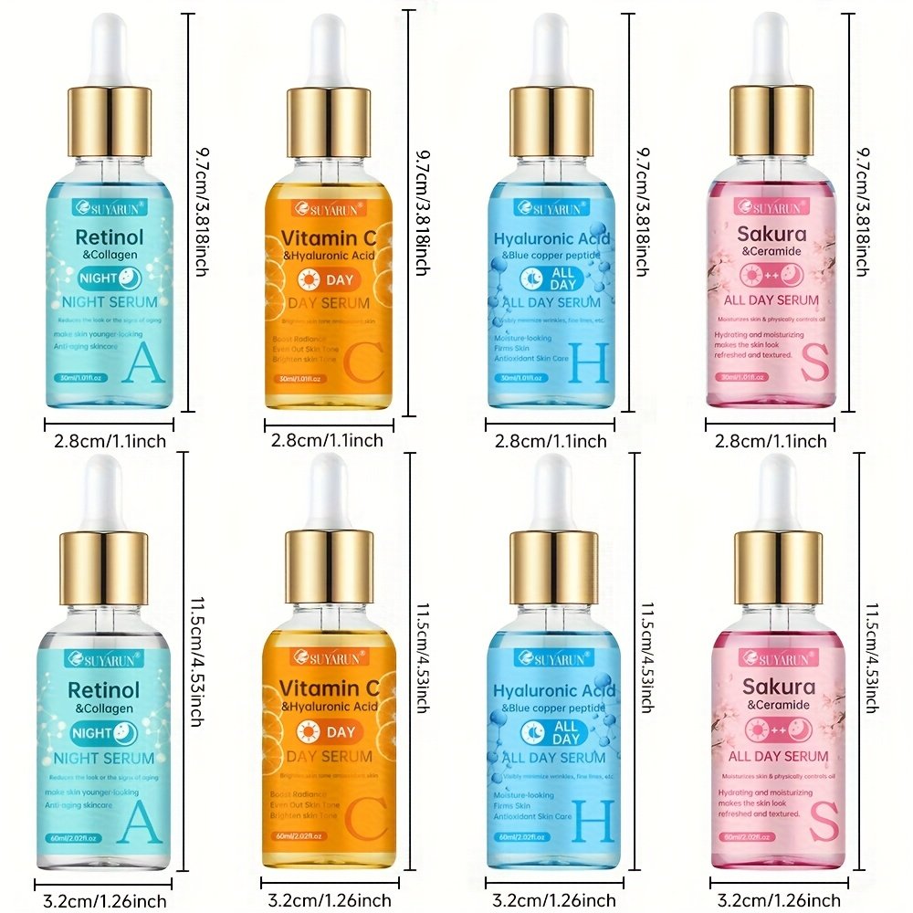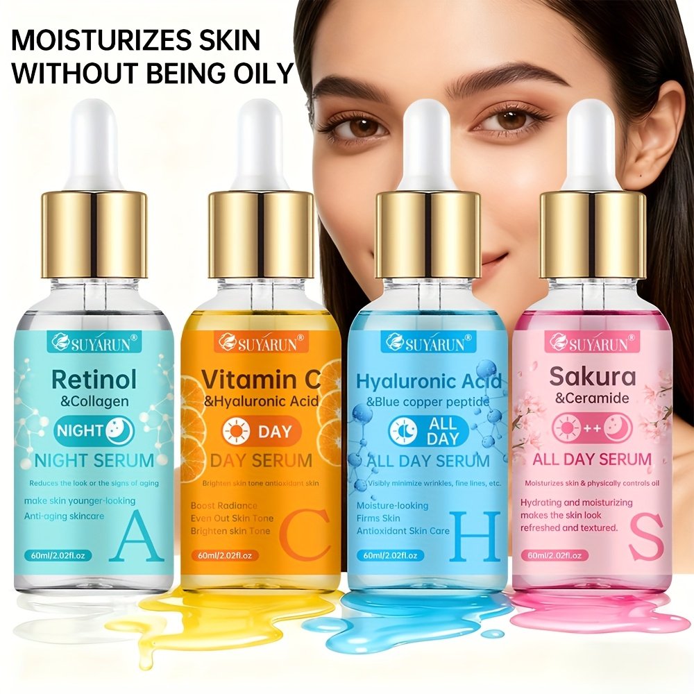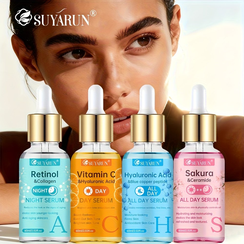 The SUYARUN 4pcs Day And Night Set Includes Vitamin C, Retinol, Hyaluronic Acid, And Cherry Blossom Ceramide Essence, Featuring Collagen, Aloe Vera, And Niacinamide to Brighten Skin Tone, Firm The Skin, Deeply Hydrate