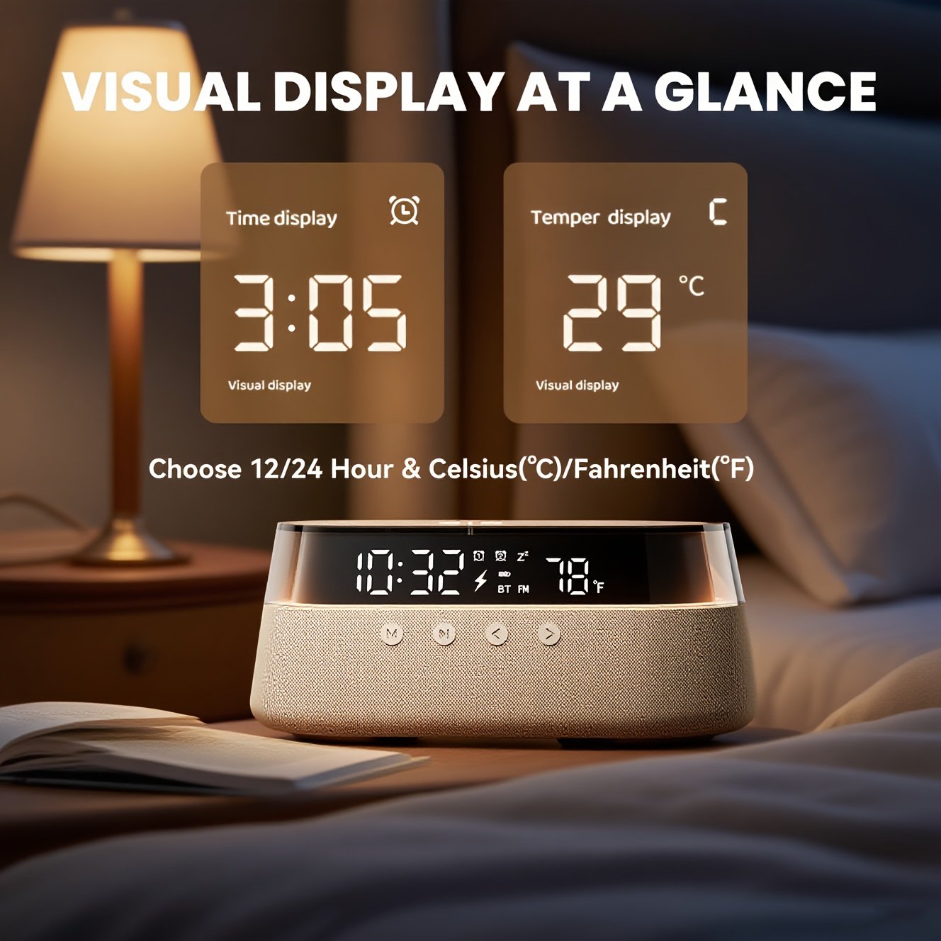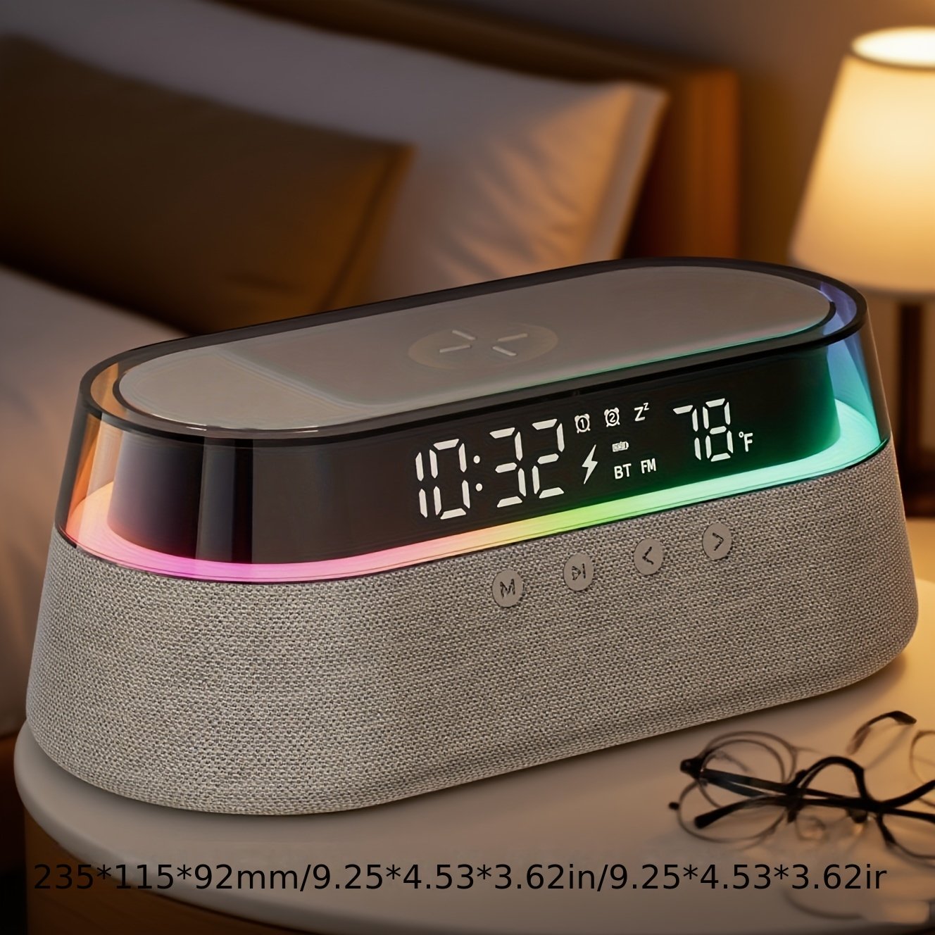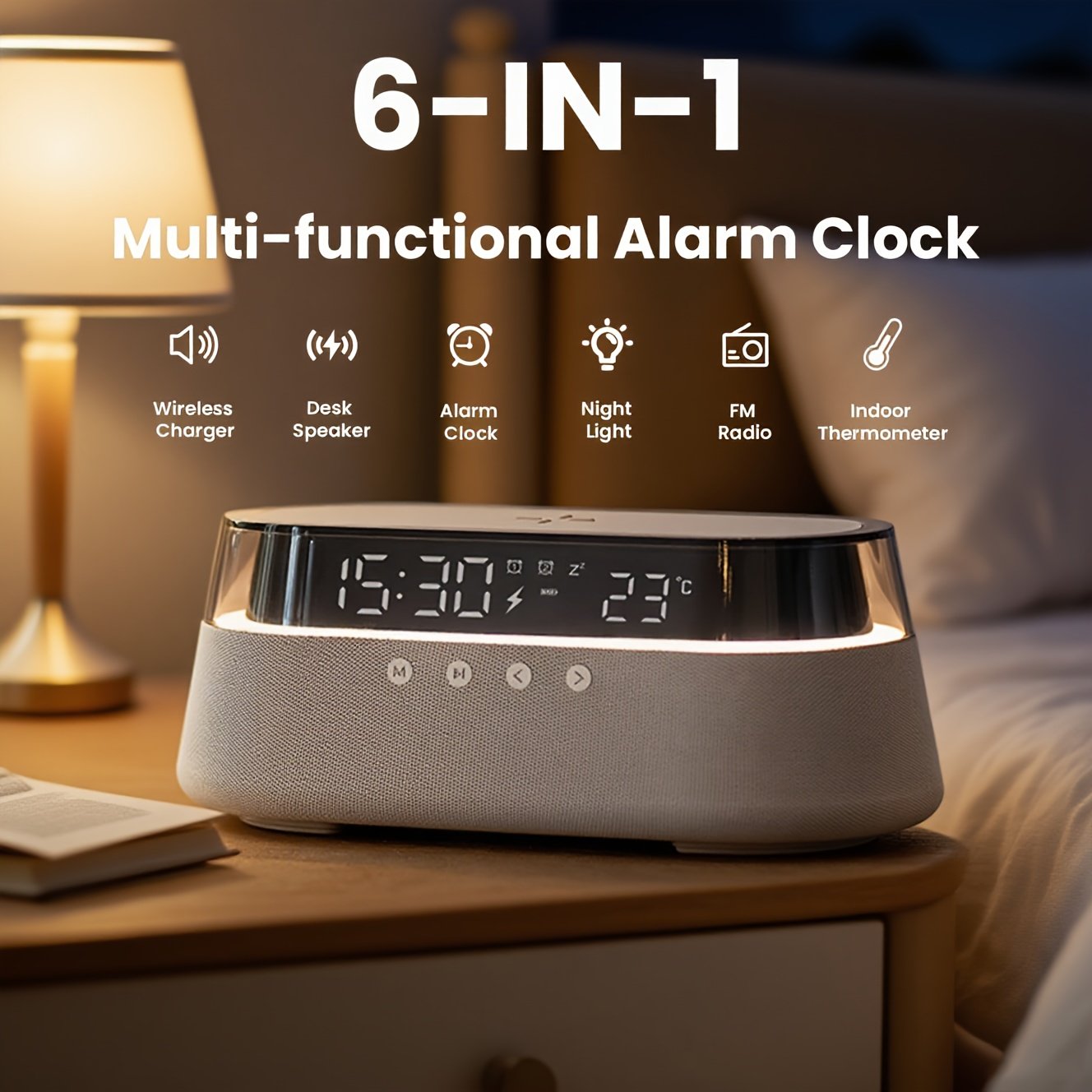 This Is a 6-In-1 Multifunctional Alarm Clock That Features 15W Wireless Charging, a Wireless Speaker, FM Radio, Dual Alarms, an Indoor Temperature Display, an RGB Night Light, And a USB Charger, Making It Perfect for Your Bedside
