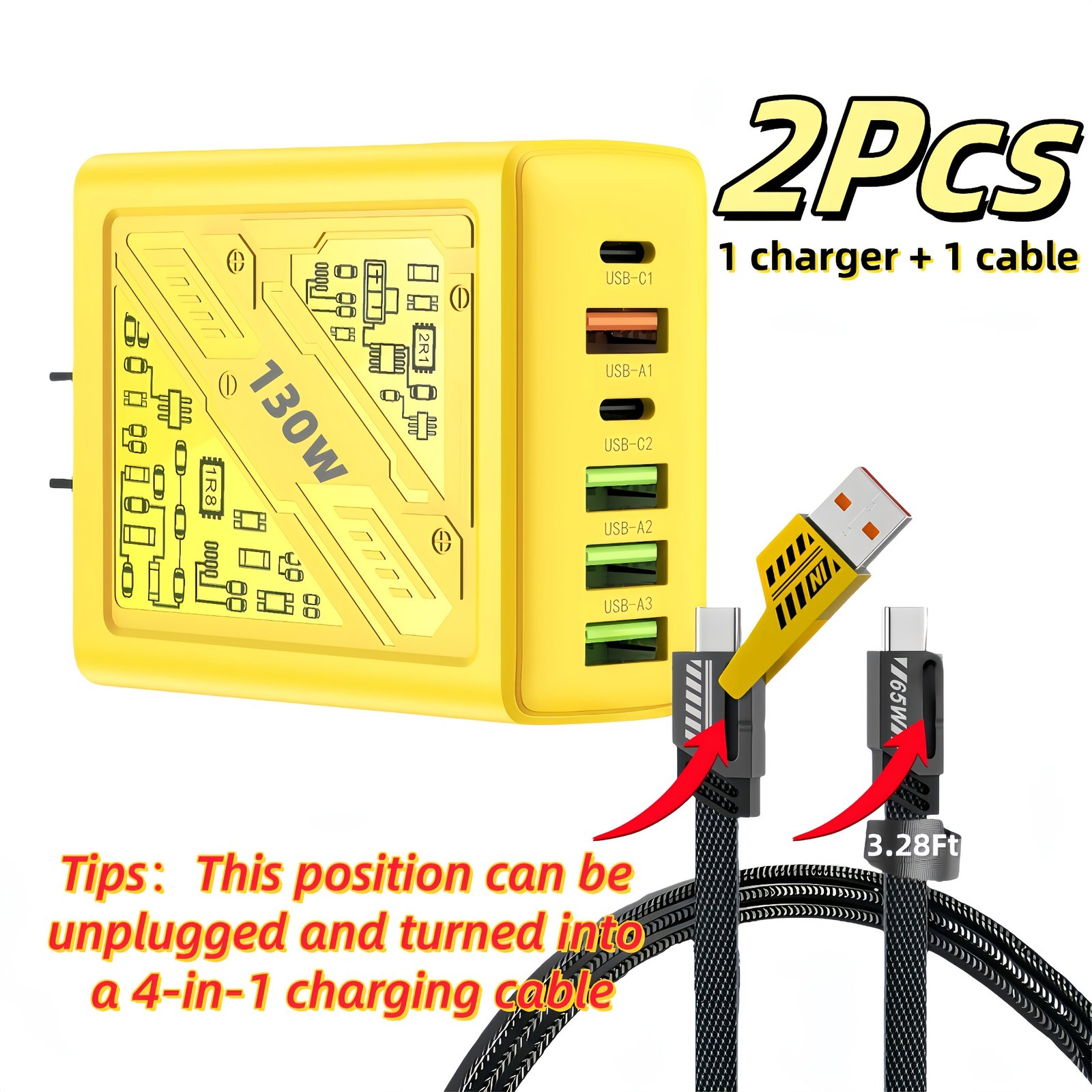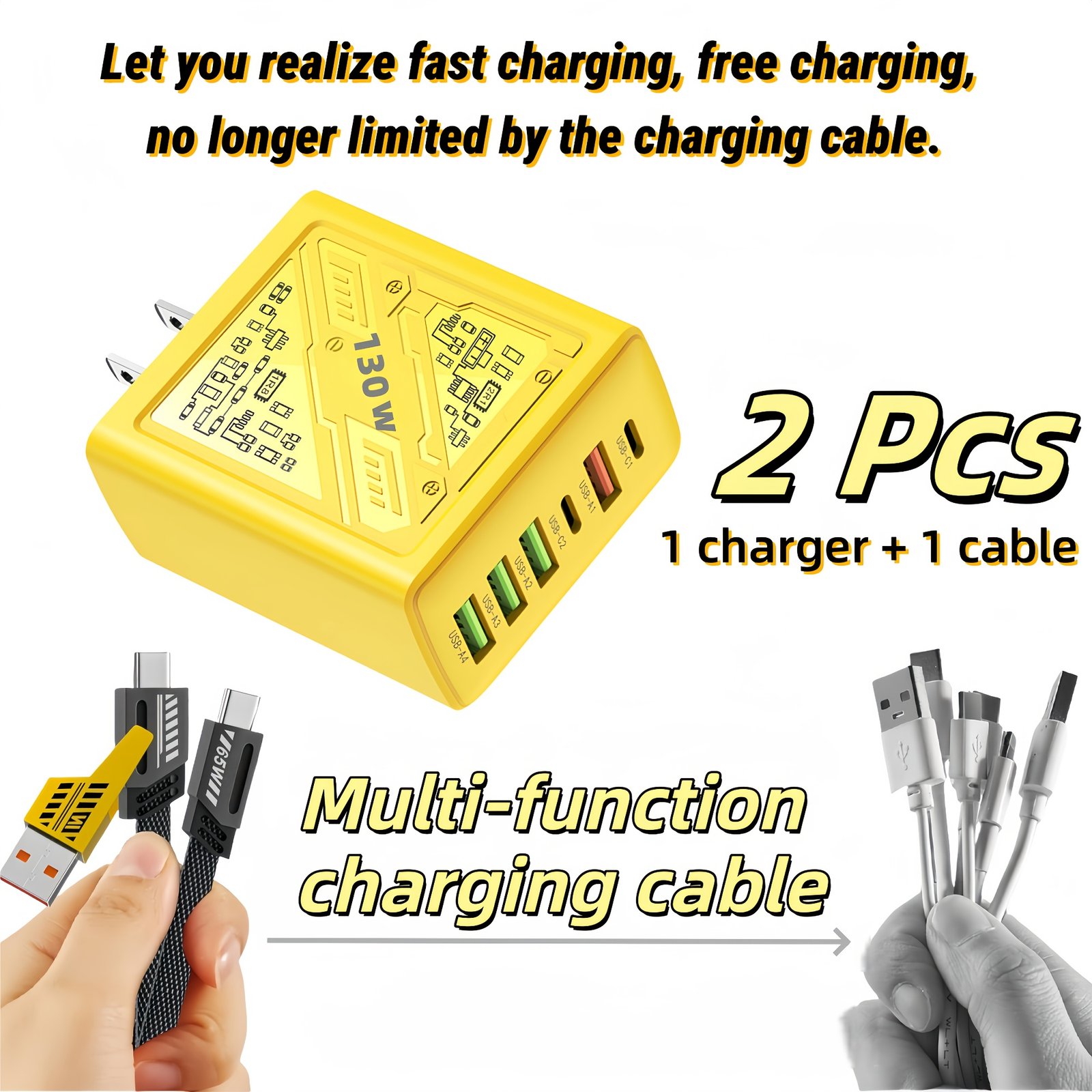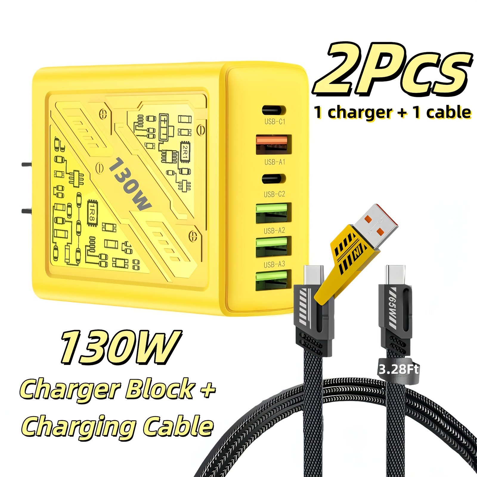Two-Piece USB C Charging Block (One Phone Charger And One Fast Type C Cable), Featuring a 6-Port PD+QC Wall Charger, Suitable for Fast Charging, Compatible with Iphones, And Designed As a Yellow Brick Charger