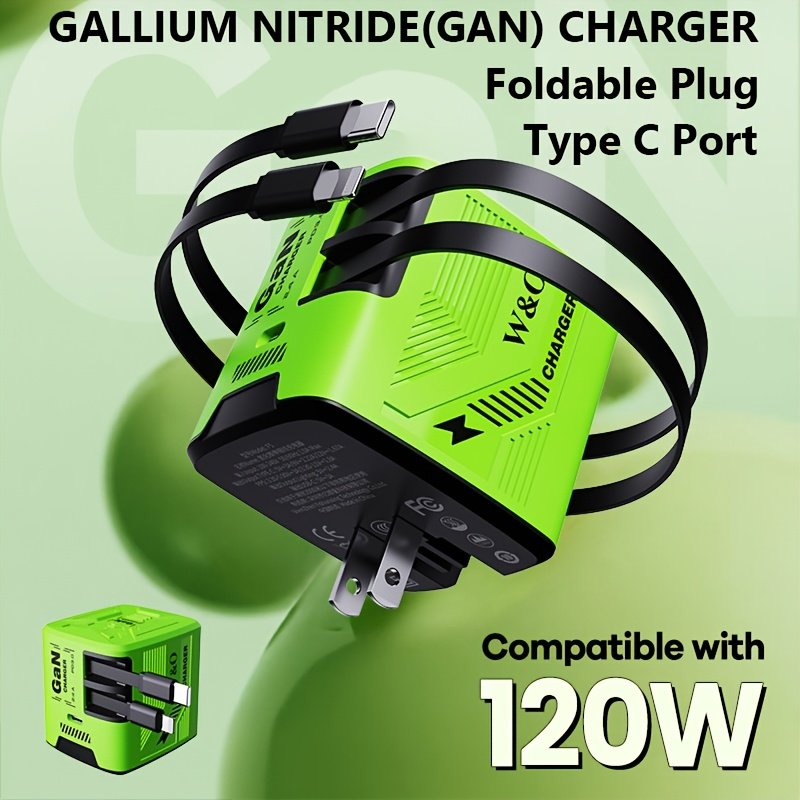 W&O Retractable GaN 120W Fast Charger – Dual 120cm/47inch Lightning+Type C Retractable Cable, Type C Output Ports, Foldable Plug – Adapter for iPhone 16/15/14/Plus/Pro Max, for S25/24 And Android Phone – Christmas Birthday Party Phone Charger.