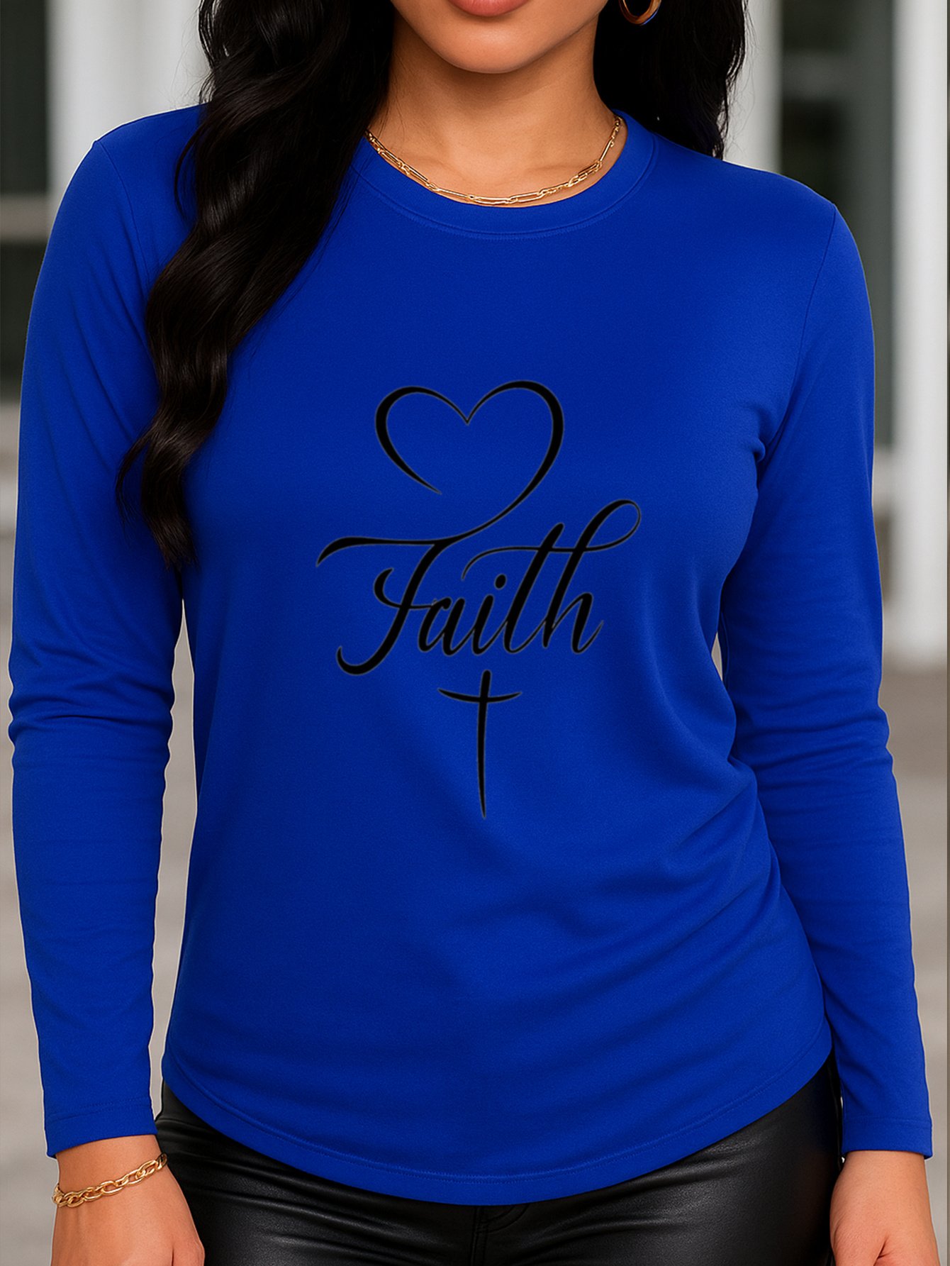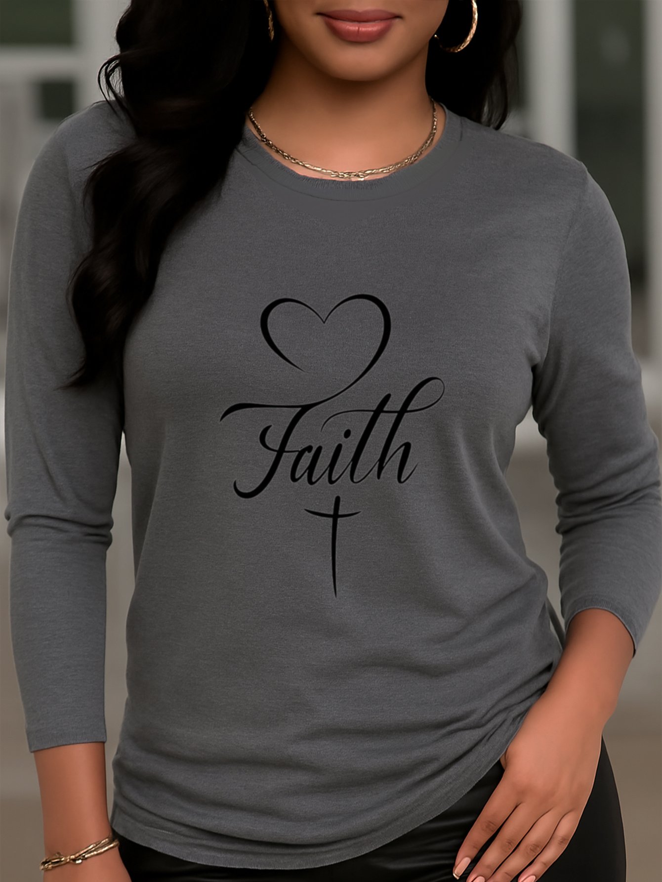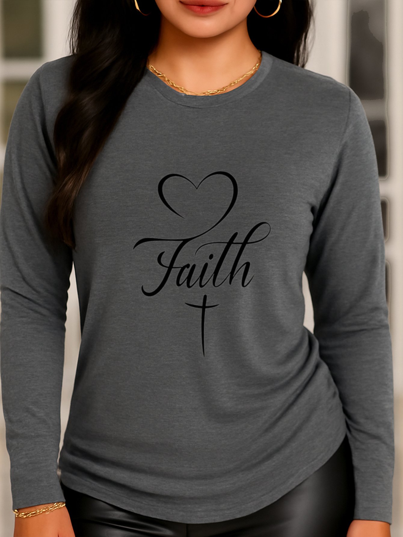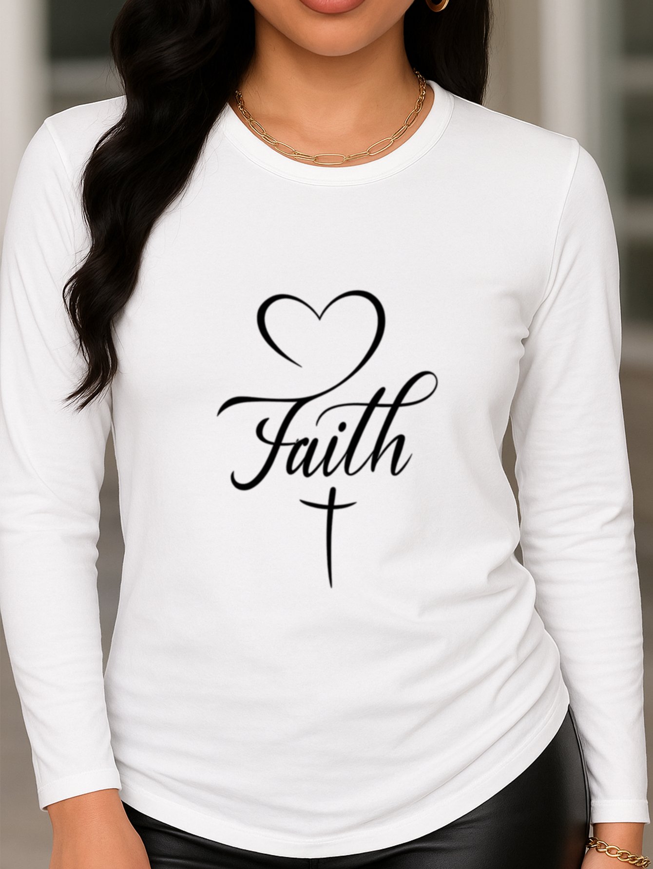 Women’s Elegant Heart & Cross Print Long-Sleeve T-Shirt – Soft Stretch Round Neck Top Suitable for Church & Casual Wear, Breathable Blouse