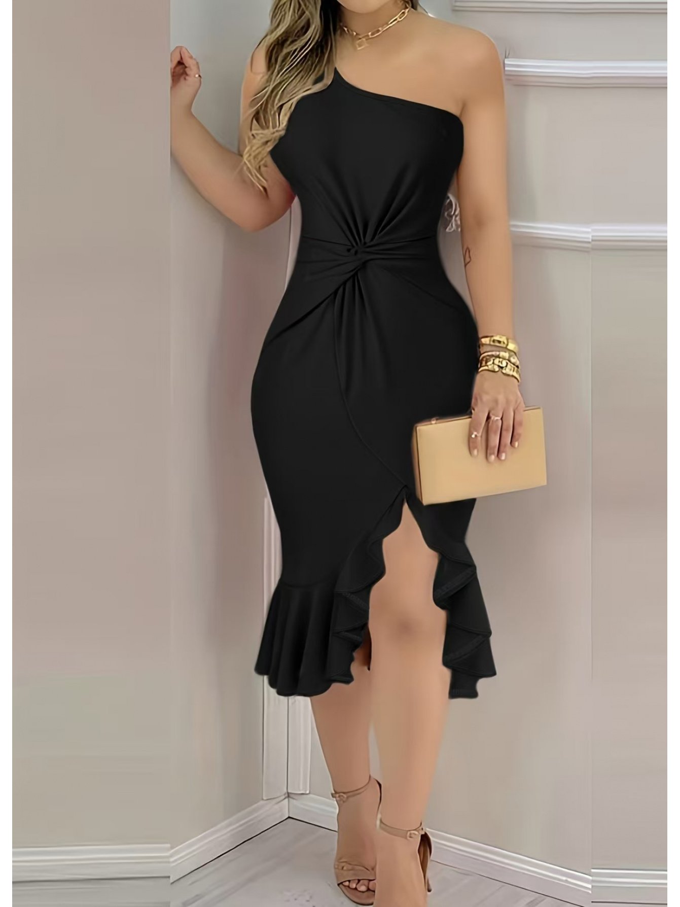 Women’s Red Off-the-Shoulder/-Shoulder Ruffle Dress – Sleeveless Fitted Wedding Guest Gown, Machine Washable Elegant Dress for Prom, Spring Summer Fall Events (Non-Stretch) – European & American Style