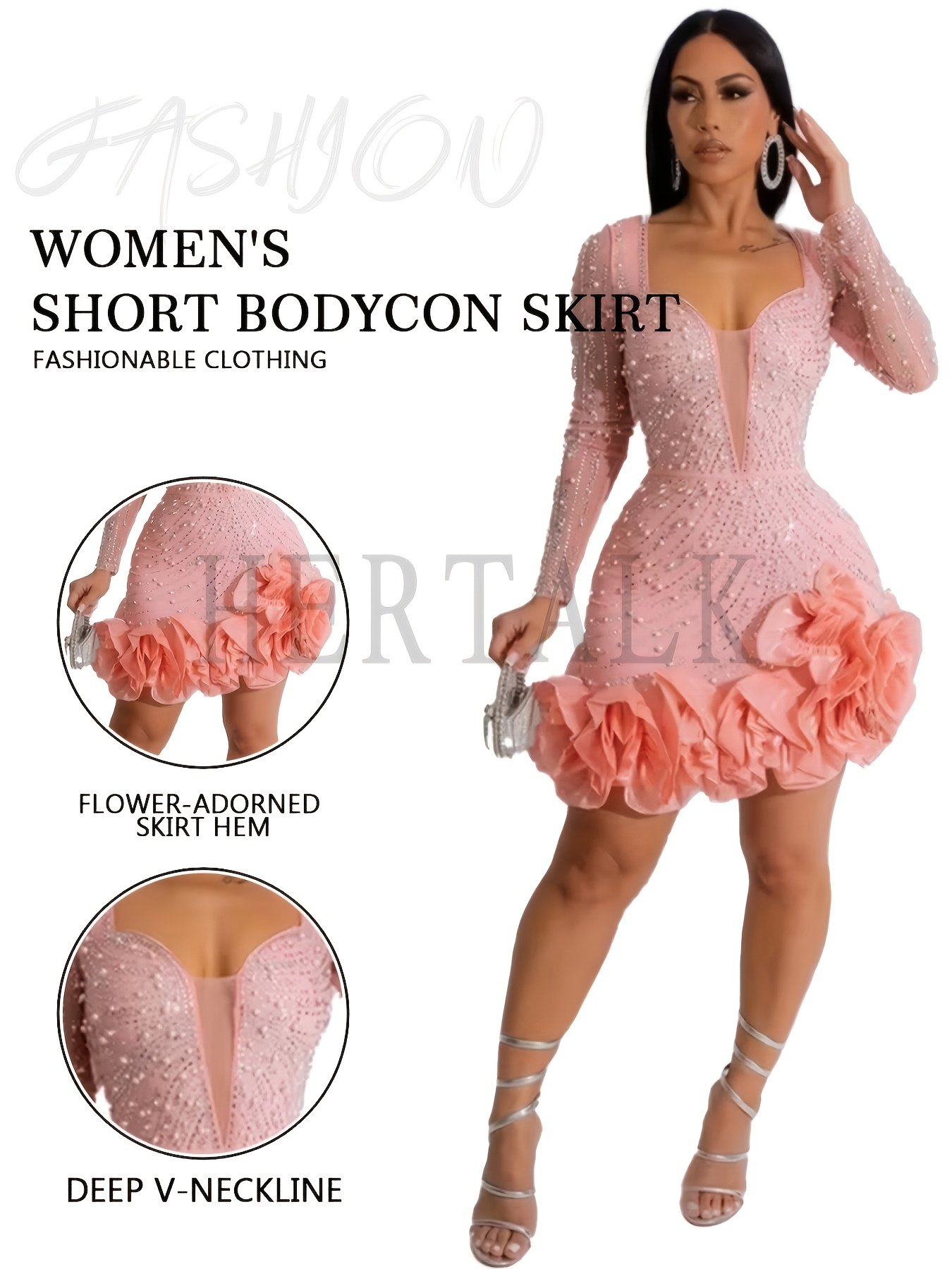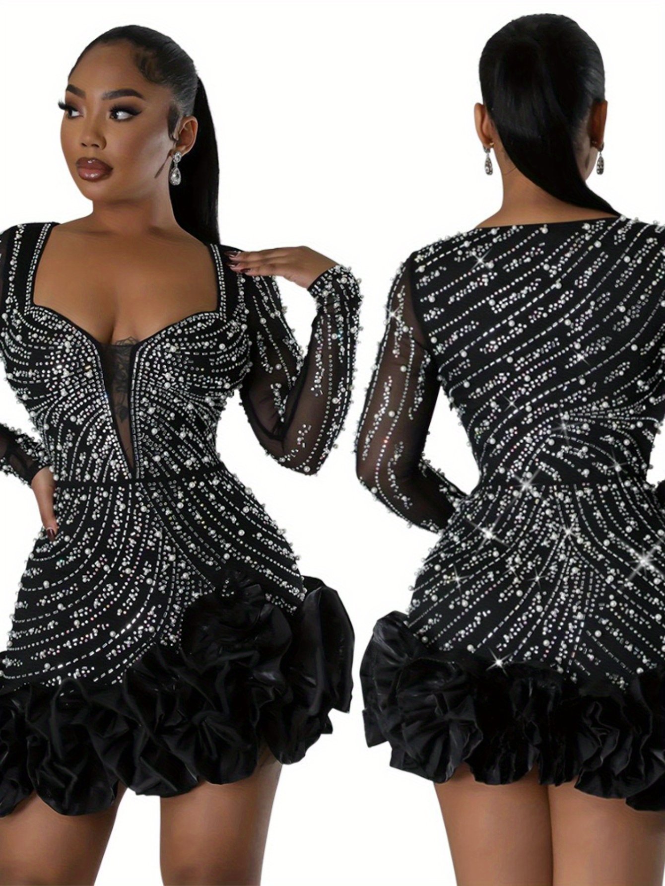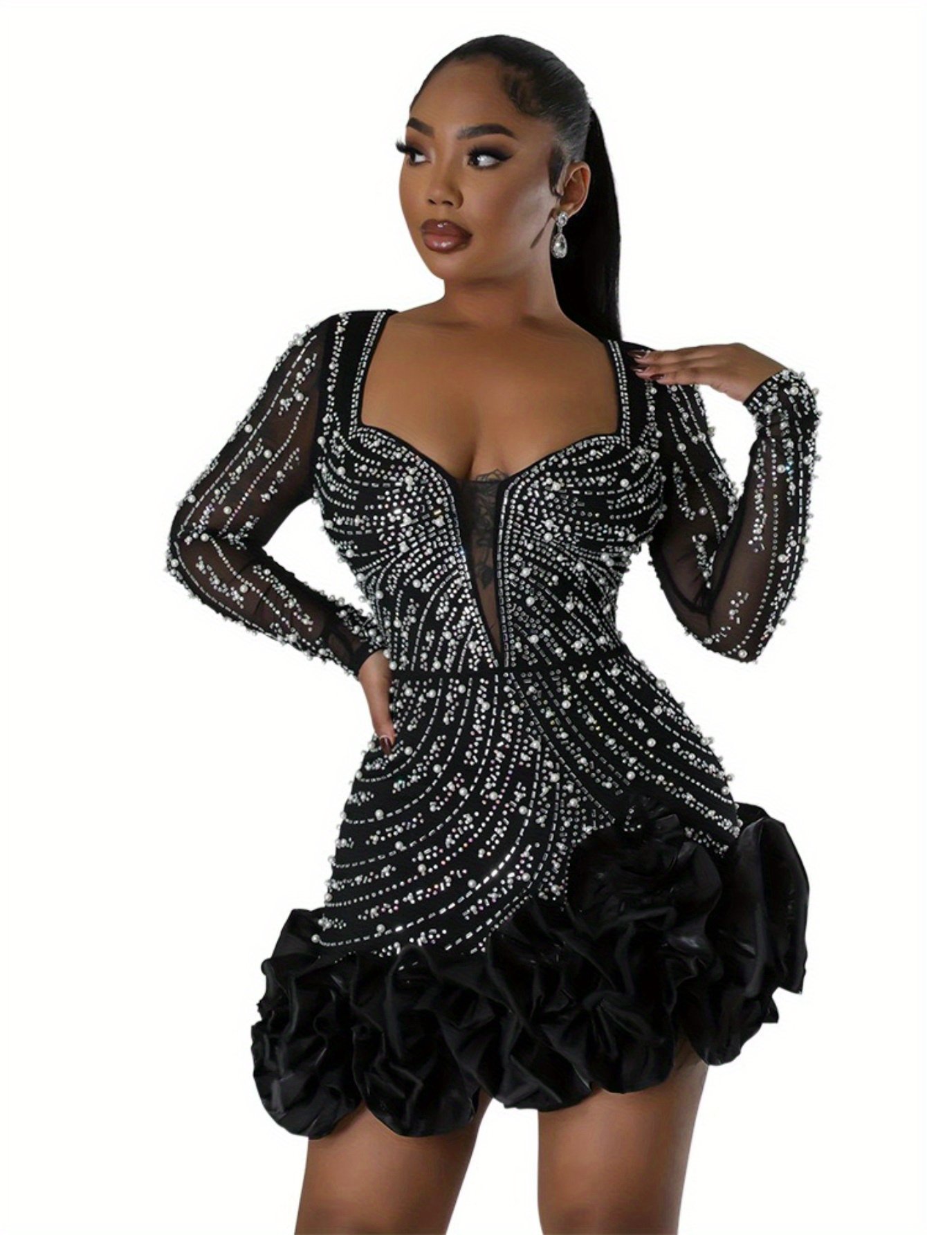 Women’s Sparkling Rhinestone & Bubble Bead Short Dress with Long Sleeves – Square Neck A-Line -Length Party Wedding Guest Gown, Semi-Sheer H-Line Silhouette, Machine Washable Prom Dress, Wedding Guest Dresses For Women, Elegant Dresses For Women Classy, Wedding Guest Dresse Evening Dress, Womens Dresses Wedding Guest, Dresses To Wear To A Wedding, Bridesmaid Dress, Fall Wedding Guest Dresses For Women, Elegant Dresses For Women Evening Party, Prom Dresses,