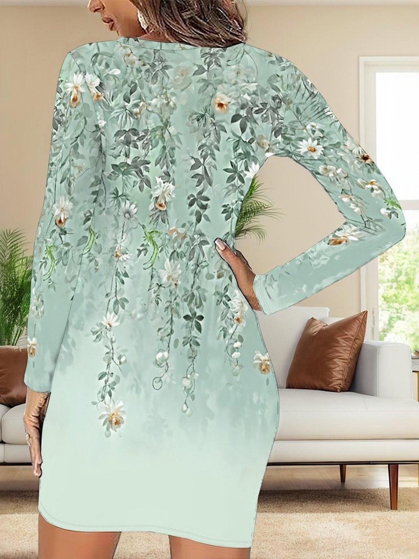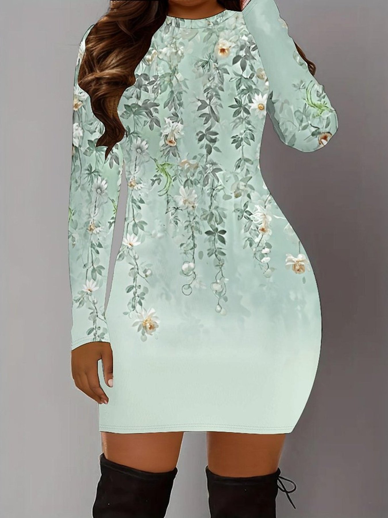 Women’S Standard-Sized 3D Printed Botanical All-Over Print Dress | Crew Neck Long-Sleeve Bodycon Style, Artistic Elegant & Versatile, Perfect for Dates & Casual Stylish Wear