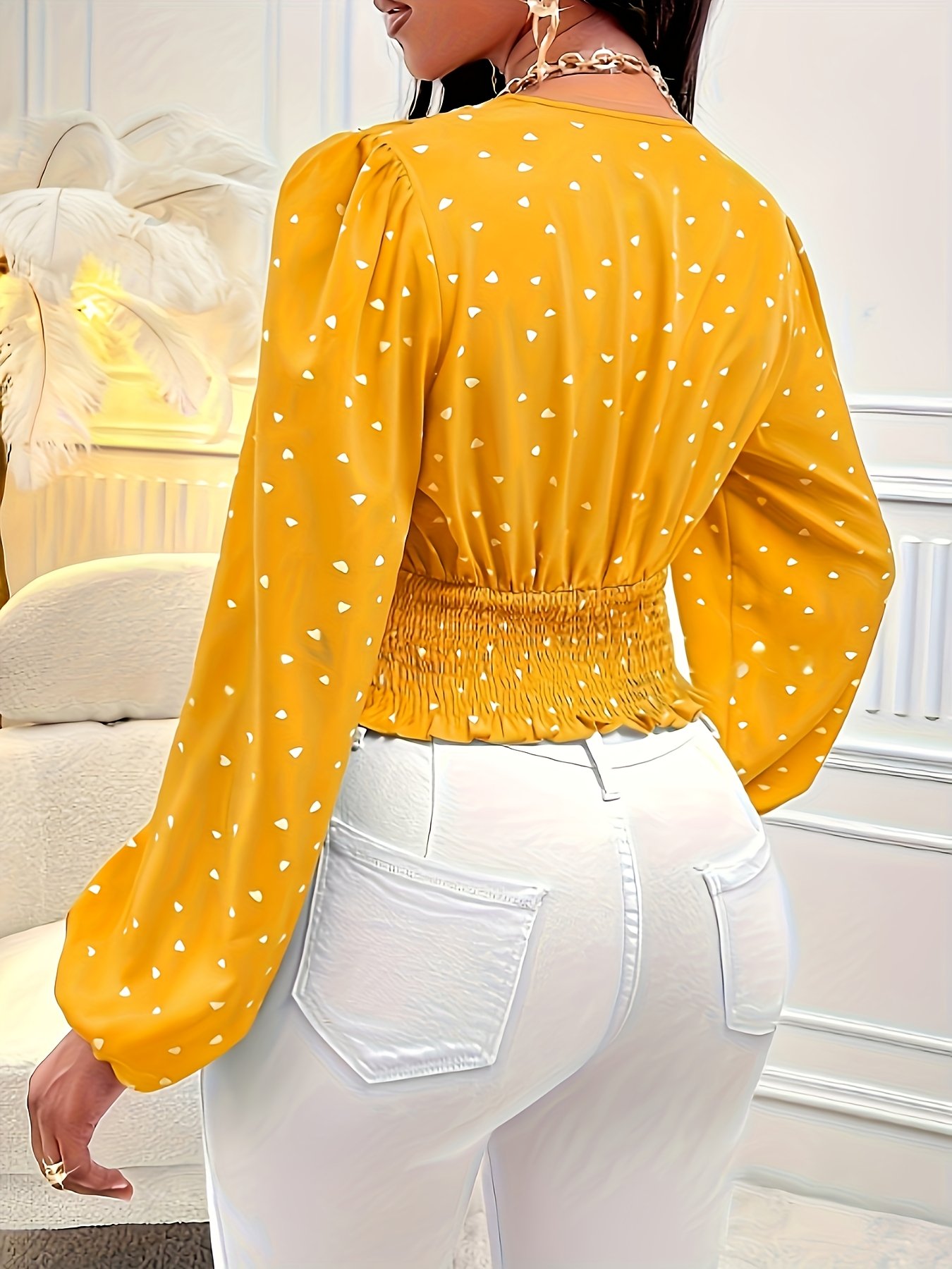 Women’S V-Neck Blouse – Mustard Yellow & Polka Dot Print Casual Chic Shirt, Lightweight Everyday Top for Spring/Summer Outfits, Office, Parties – Women’S Fashion Tops, Summer Wardrobe, Trendy Design, Comfortable Fit, Stylish Shirt, Summer Clothing, Party Attire, Breathable Material, Printed Shirt, Women